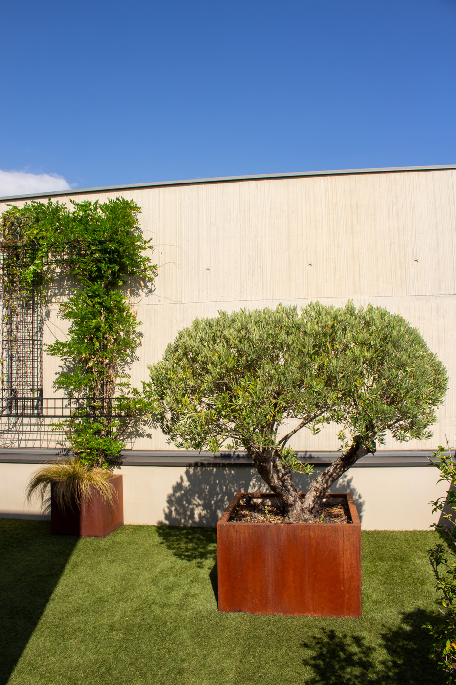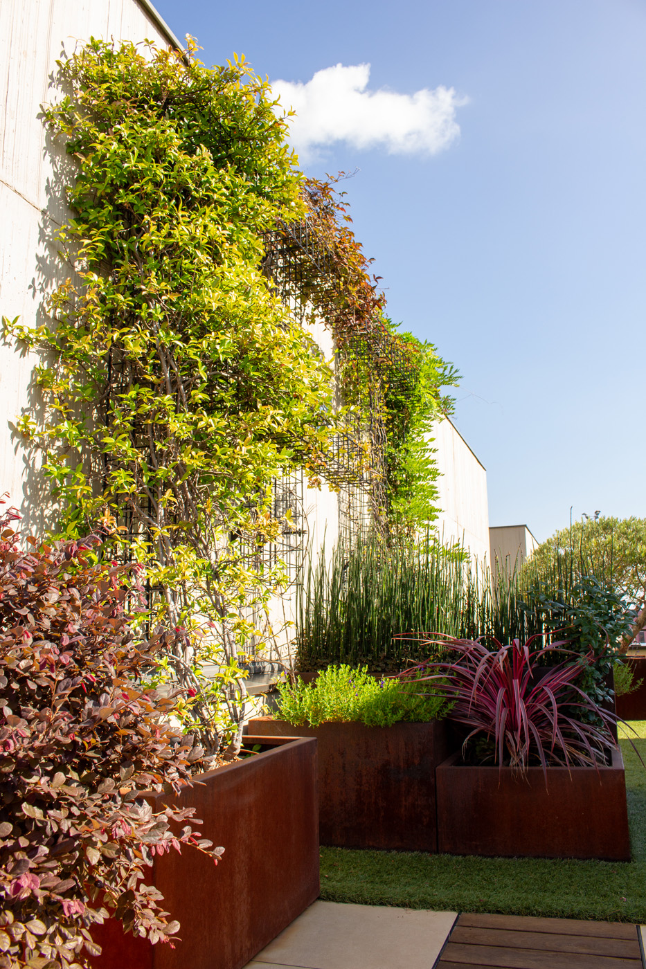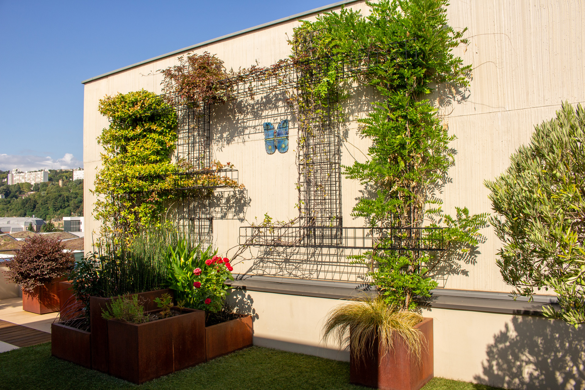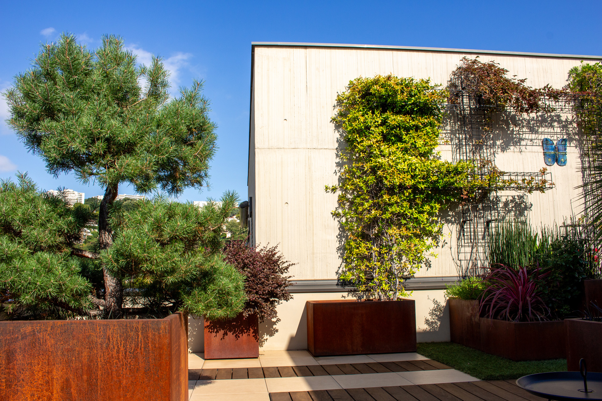 Afin de réduire l’effet de surface de cette grande terrasse, nous avons remplacé des zones de carreaux par des caillebotis en bois exotique (ipé), la végétalisation de la terrasse n’étant possible qu’en bacs, j’avais alors opté pour des bacs en acier corten, dont la corrosion décorative s’associera parfaitement avec le mur en béton décoratif. Des bacs isolés, ou des groupes de bacs, permettent de définir les espaces de vie, sans pour autant pénaliser la circulation entre ces différents espaces. S’il était essentiel de ne pas couper les axes de vues environnants sur la ville, d’autres vis-à-vis ont été supprimés par la végétation. Afin d’habiller ce grand mur en béton, j’ai dessiné un ensemble de colonnes en acier, suspendues par des équerres fabriquées spécialement sur mesure par nos soins. L’ensemble a ensuite été peint en noir mat par l’un de nos partenaires. La vue sur le mur est ainsi préservée à hauteur de ce que nous souhaitions, et les volumes apportés par cette végétation palissée sur nos supports ne réduit pas l’impression d’espace. L’arrosage automatique installé dans chaque bac permet aux plantes de se développer dans les meilleurs conditions, malgré une exposition très chaude et ventée. La nuit, l’éclairage d’ambiance met en valeur les végétaux plantés, et assure une vie en toute saison à ce bel espace depuis l’appartement.