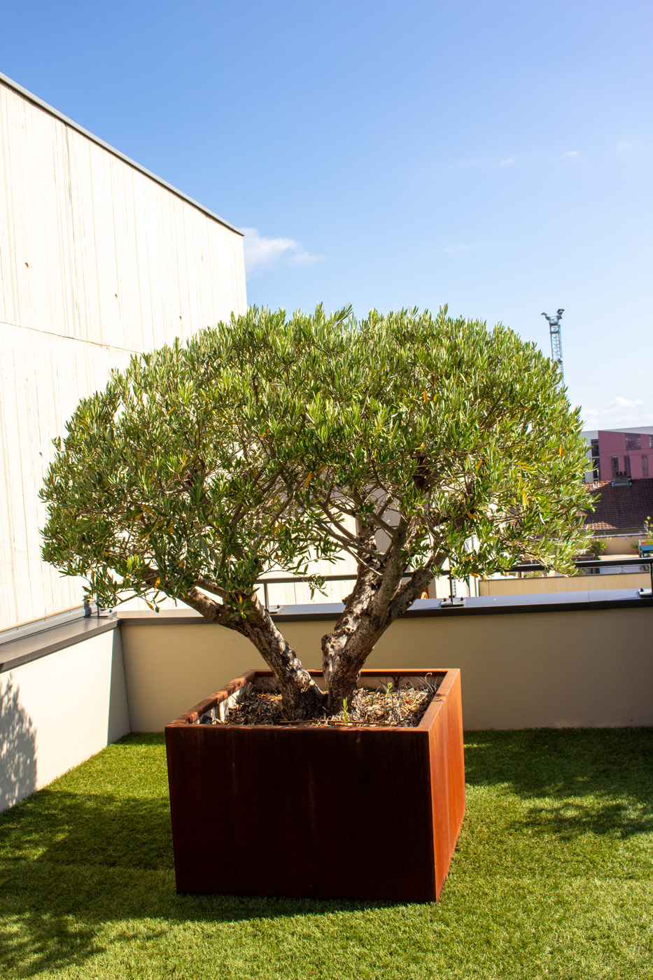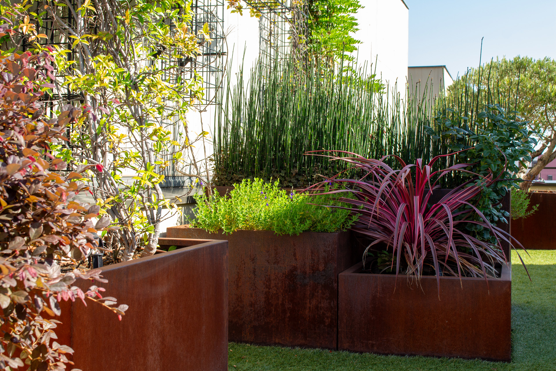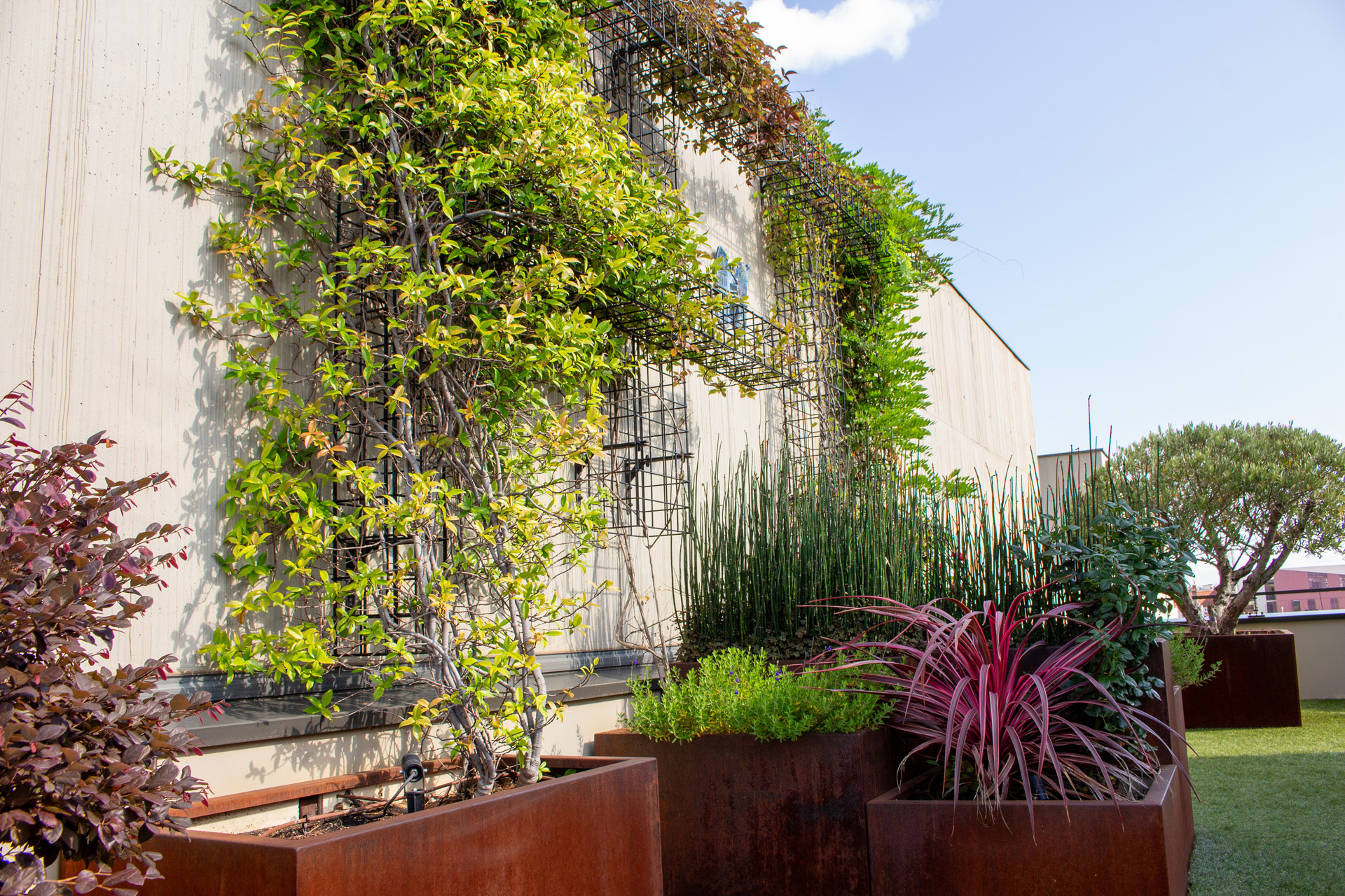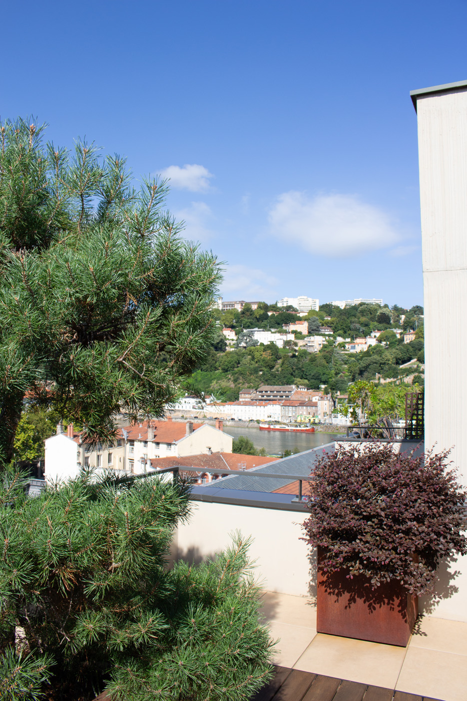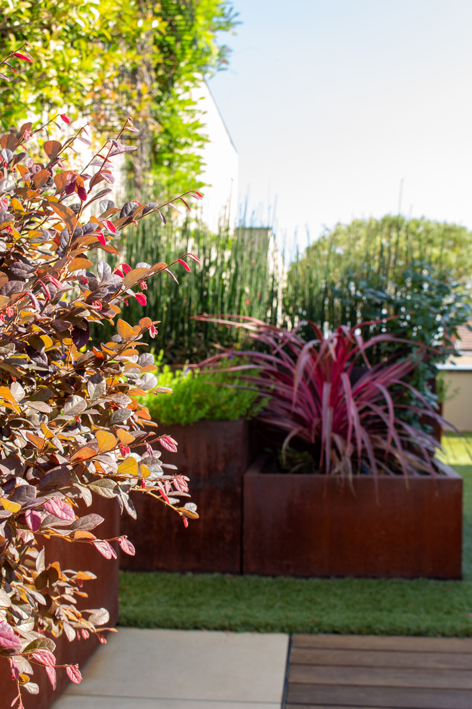 Afin de réduire l’effet de surface de cette grande terrasse, nous avons remplacé des zones de carreaux par des caillebotis en bois exotique (ipé), la végétalisation de la terrasse n’étant possible qu’en bacs, j’avais alors opté pour des bacs en acier corten, dont la corrosion décorative s’associera parfaitement avec le mur en béton décoratif. Des bacs isolés, ou des groupes de bacs, permettent de définir les espaces de vie, sans pour autant pénaliser la circulation entre ces différents espaces. S’il était essentiel de ne pas couper les axes de vues environnants sur la ville, d’autres vis-à-vis ont été supprimés par la végétation. Afin d’habiller ce grand mur en béton, j’ai dessiné un ensemble de colonnes en acier, suspendues par des équerres fabriquées spécialement sur mesure par nos soins. L’ensemble a ensuite été peint en noir mat par l’un de nos partenaires. La vue sur le mur est ainsi préservée à hauteur de ce que nous souhaitions, et les volumes apportés par cette végétation palissée sur nos supports ne réduit pas l’impression d’espace. L’arrosage automatique installé dans chaque bac permet aux plantes de se développer dans les meilleurs conditions, malgré une exposition très chaude et ventée. La nuit, l’éclairage d’ambiance met en valeur les végétaux plantés, et assure une vie en toute saison à ce bel espace depuis l’appartement.