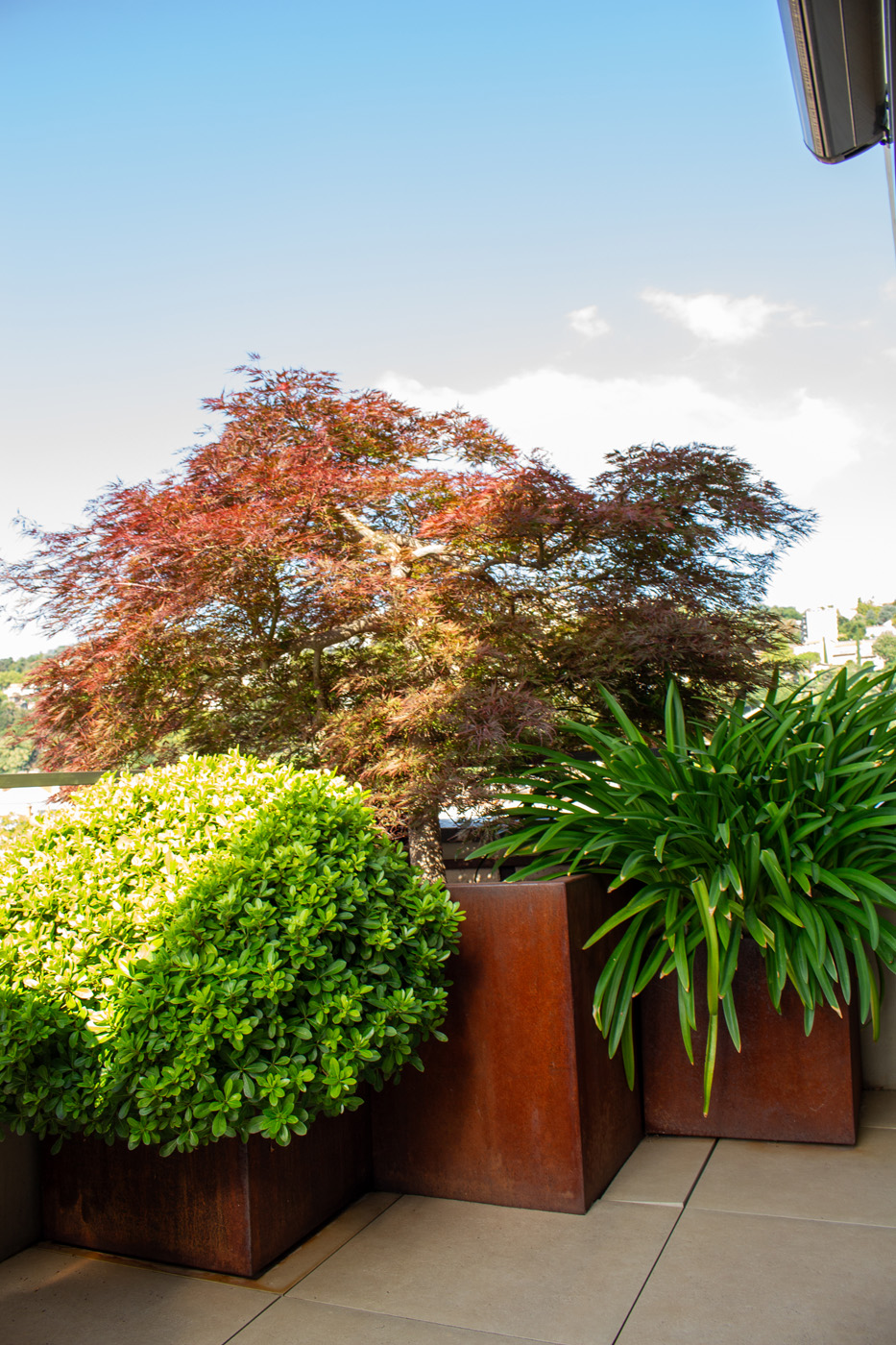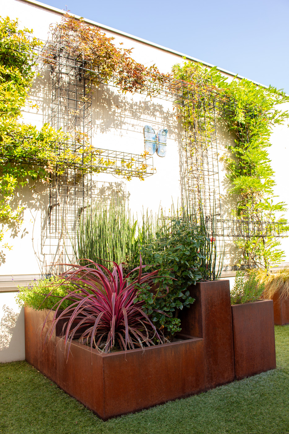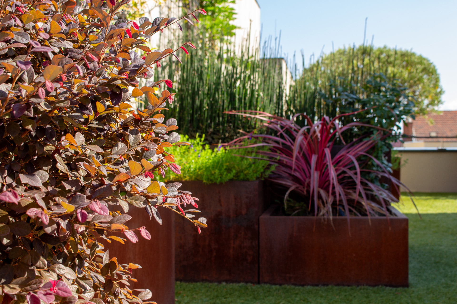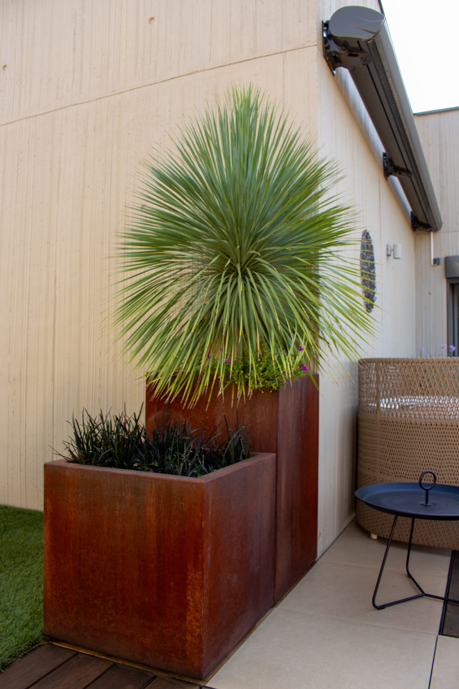 Afin de réduire l’effet de surface de cette grande terrasse, nous avons remplacé des zones de carreaux par des caillebotis en bois exotique (ipé), la végétalisation de la terrasse n’étant possible qu’en bacs, j’avais alors opté pour des bacs en acier corten, dont la corrosion décorative s’associera parfaitement avec le mur en béton décoratif. Des bacs isolés, ou des groupes de bacs, permettent de définir les espaces de vie, sans pour autant pénaliser la circulation entre ces différents espaces. S’il était essentiel de ne pas couper les axes de vues environnants sur la ville, d’autres vis-à-vis ont été supprimés par la végétation. Afin d’habiller ce grand mur en béton, j’ai dessiné un ensemble de colonnes en acier, suspendues par des équerres fabriquées spécialement sur mesure par nos soins. L’ensemble a ensuite été peint en noir mat par l’un de nos partenaires. La vue sur le mur est ainsi préservée à hauteur de ce que nous souhaitions, et les volumes apportés par cette végétation palissée sur nos supports ne réduit pas l’impression d’espace. L’arrosage automatique installé dans chaque bac permet aux plantes de se développer dans les meilleurs conditions, malgré une exposition très chaude et ventée. La nuit, l’éclairage d’ambiance met en valeur les végétaux plantés, et assure une vie en toute saison à ce bel espace depuis l’appartement.