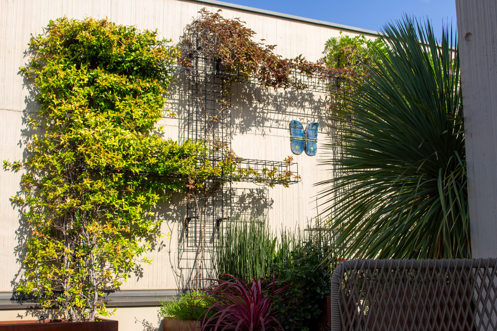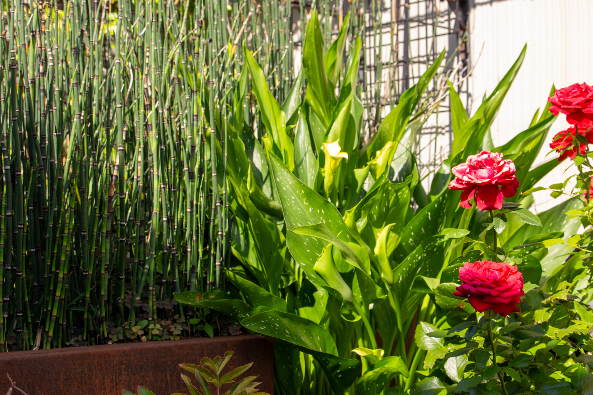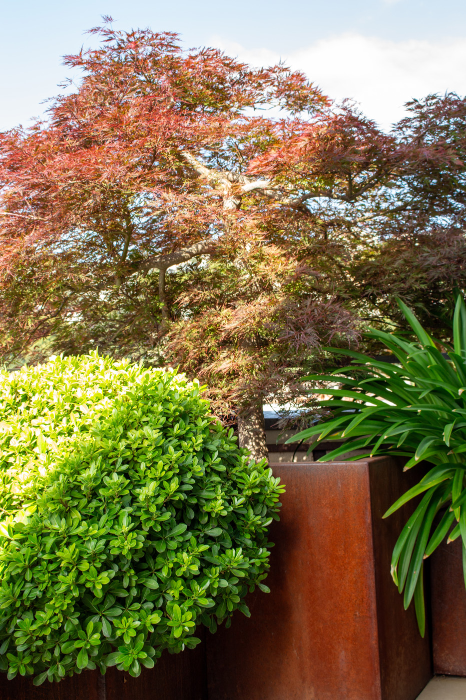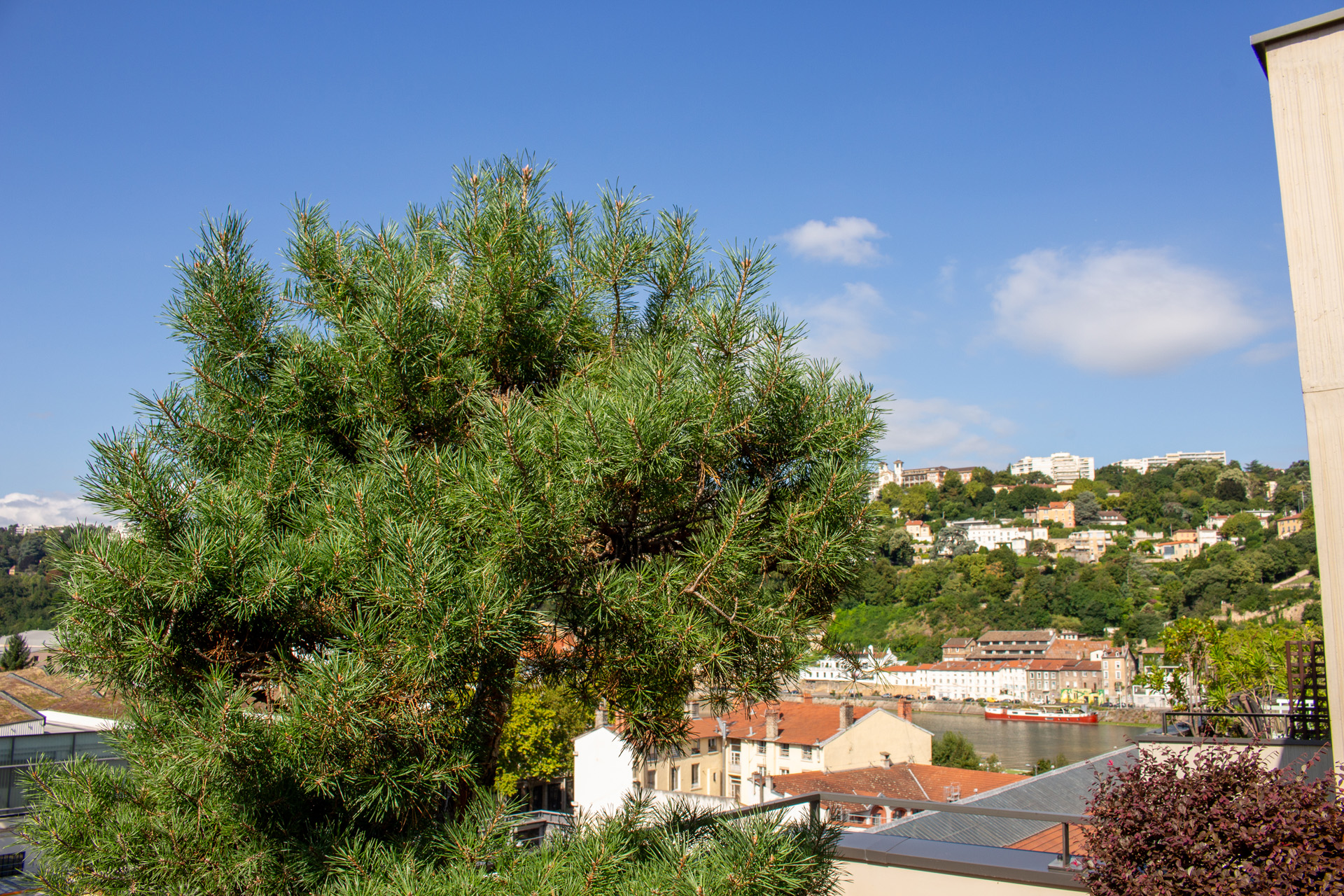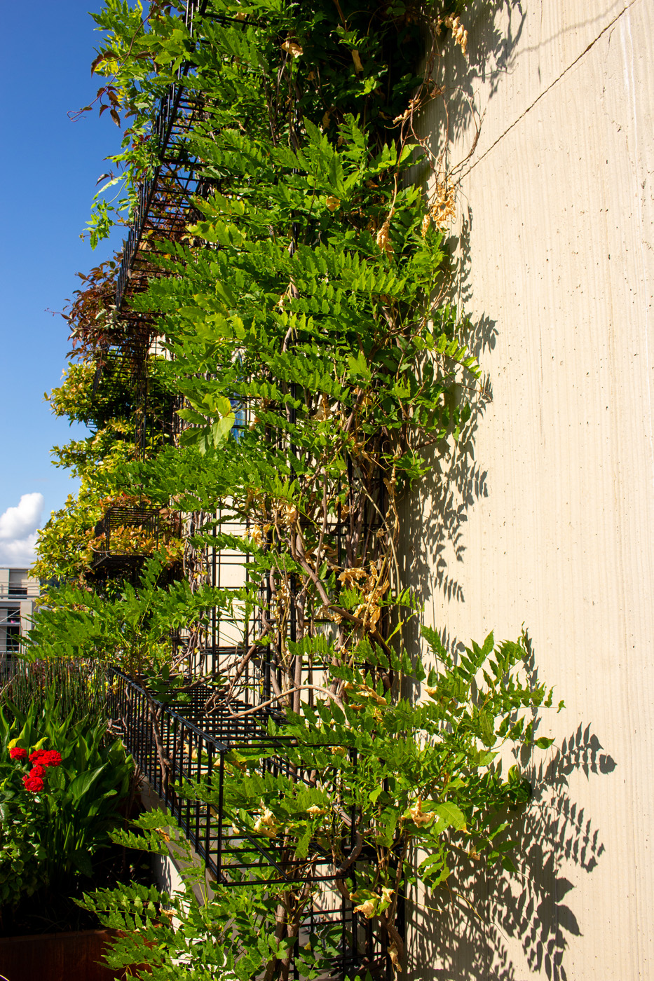 Afin de réduire l’effet de surface de cette grande terrasse, nous avons remplacé des zones de carreaux par des caillebotis en bois exotique (ipé), la végétalisation de la terrasse n’étant possible qu’en bacs, j’avais alors opté pour des bacs en acier corten, dont la corrosion décorative s’associera parfaitement avec le mur en béton décoratif. Des bacs isolés, ou des groupes de bacs, permettent de définir les espaces de vie, sans pour autant pénaliser la circulation entre ces différents espaces. S’il était essentiel de ne pas couper les axes de vues environnants sur la ville, d’autres vis-à-vis ont été supprimés par la végétation. Afin d’habiller ce grand mur en béton, j’ai dessiné un ensemble de colonnes en acier, suspendues par des équerres fabriquées spécialement sur mesure par nos soins. L’ensemble a ensuite été peint en noir mat par l’un de nos partenaires. La vue sur le mur est ainsi préservée à hauteur de ce que nous souhaitions, et les volumes apportés par cette végétation palissée sur nos supports ne réduit pas l’impression d’espace. L’arrosage automatique installé dans chaque bac permet aux plantes de se développer dans les meilleurs conditions, malgré une exposition très chaude et ventée. La nuit, l’éclairage d’ambiance met en valeur les végétaux plantés, et assure une vie en toute saison à ce bel espace depuis l’appartement.