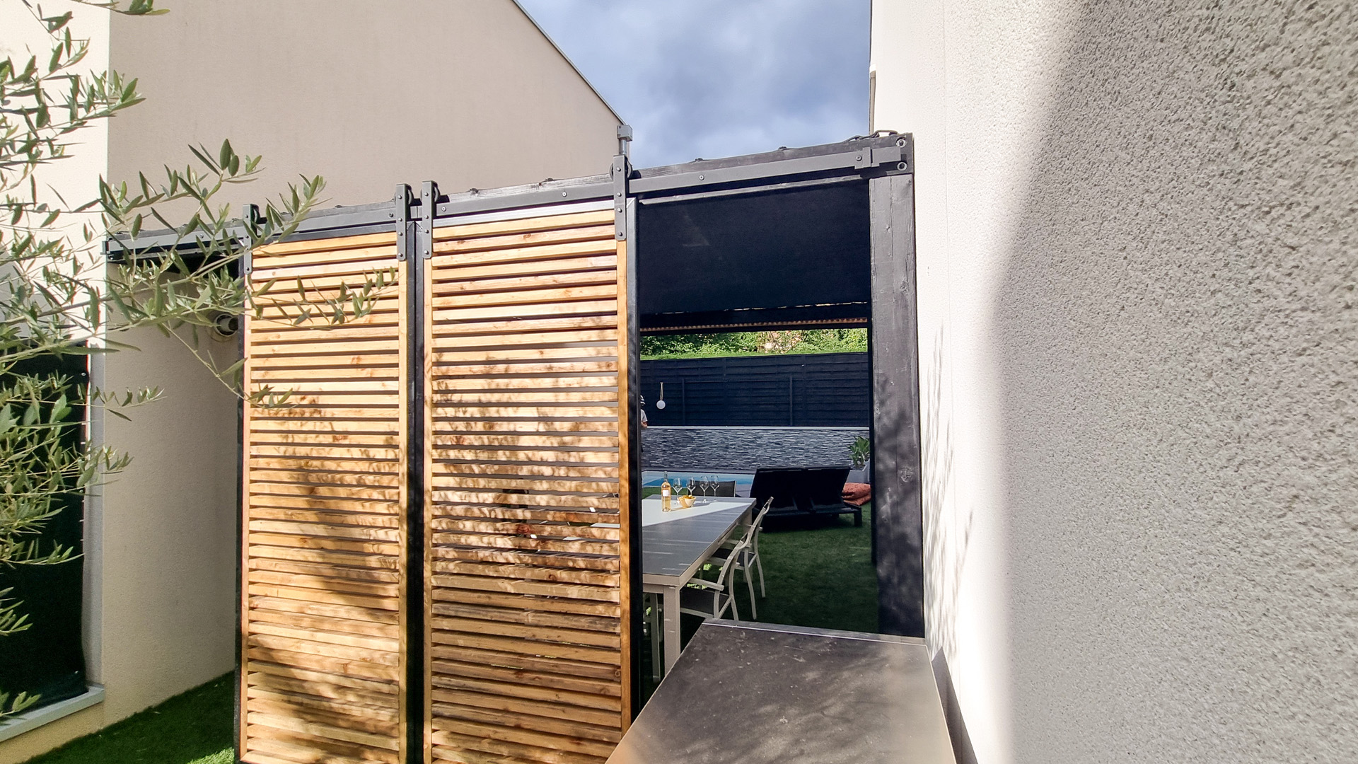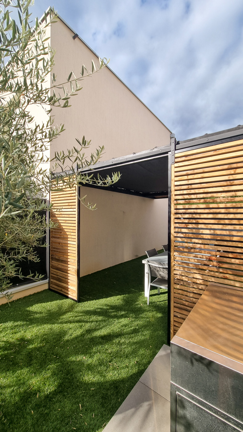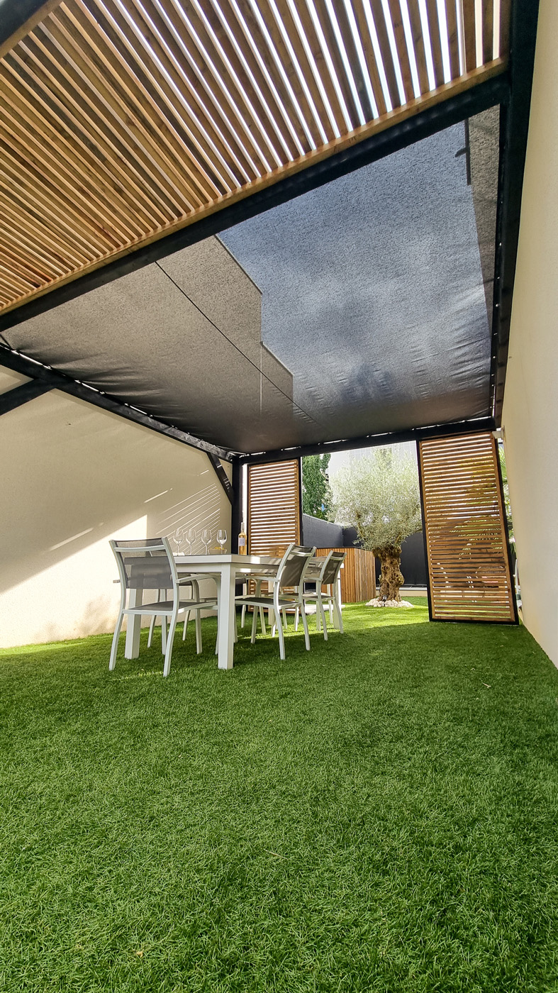 Nous avions dans un premier temps travaillé à l’aménagement complet de ce petit jardin urbain. Sur la base de notre étude paysagère, une piscine coque a été installée, et nous avons créé la plage attenante à la maison. L’espace jardin avait été recouvert de gazon synthétique, et les végétaux déjà présents transplantés. Afin de répondre au souhait de mes clients, j’ai dessiné une pergola occupant les quatre mètres de large de cette bande de jardin. Le bois teinté noir, ainsi que la toile micro-perforée (Serge Ferrari – Soltis 92) en couverture en font un espace intime, et moins bruyant. Nous avons fabriqué à notre atelier des cadres en acier laqués noirs, remplis de tasseaux mélèze en clairevoie. Ces panneaux coulissants le long d’un rail permettent de masquer à loisir les vis à vis depuis l’immeuble voisin. Une casquette brise-soleil, en débord de la structure côté piscine, prolonge avec légèreté la pergola, rendant la transition entre les espaces plus douces à l’œil.