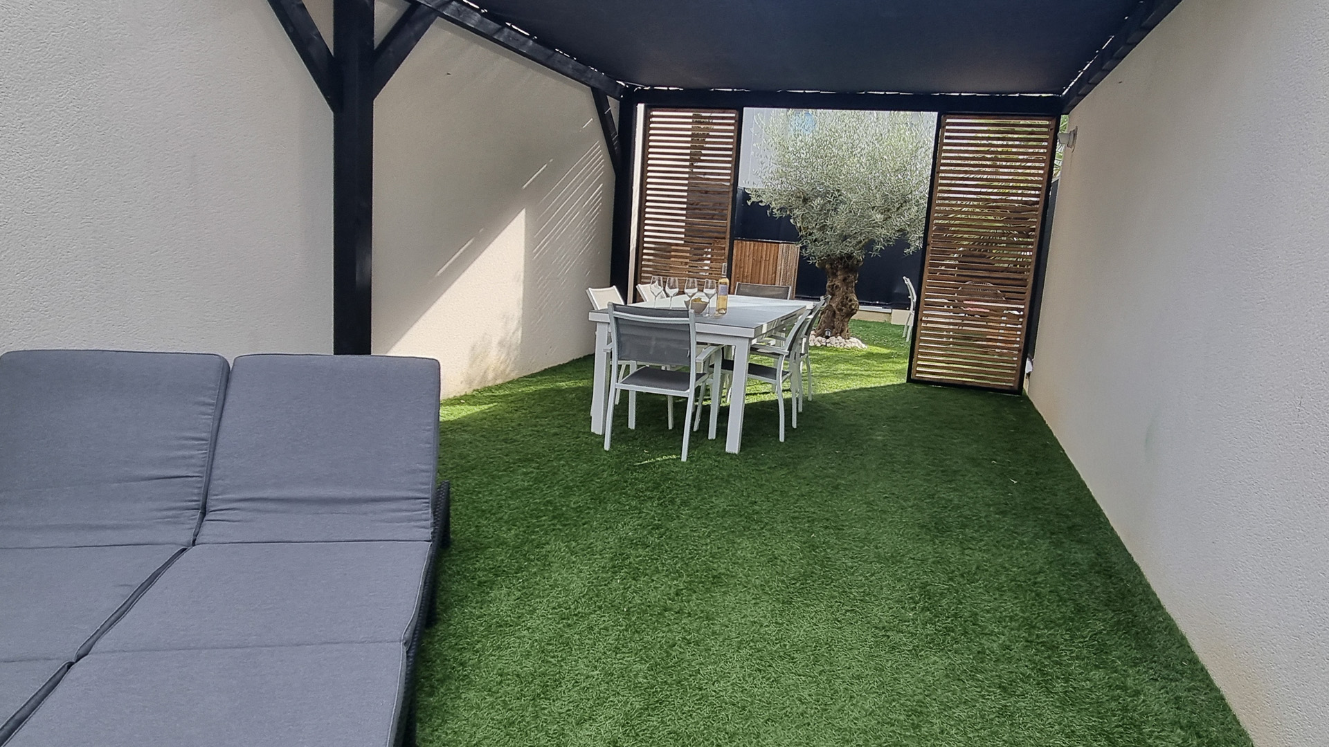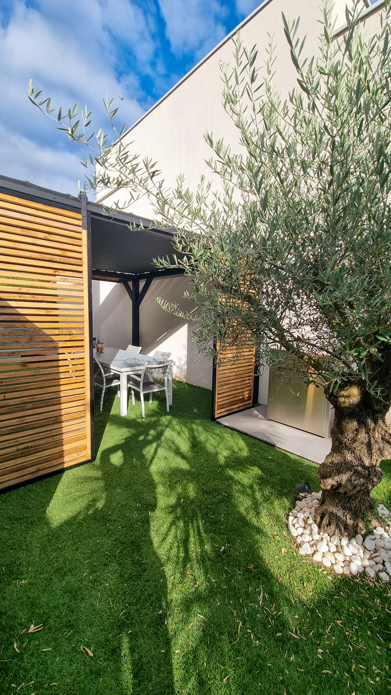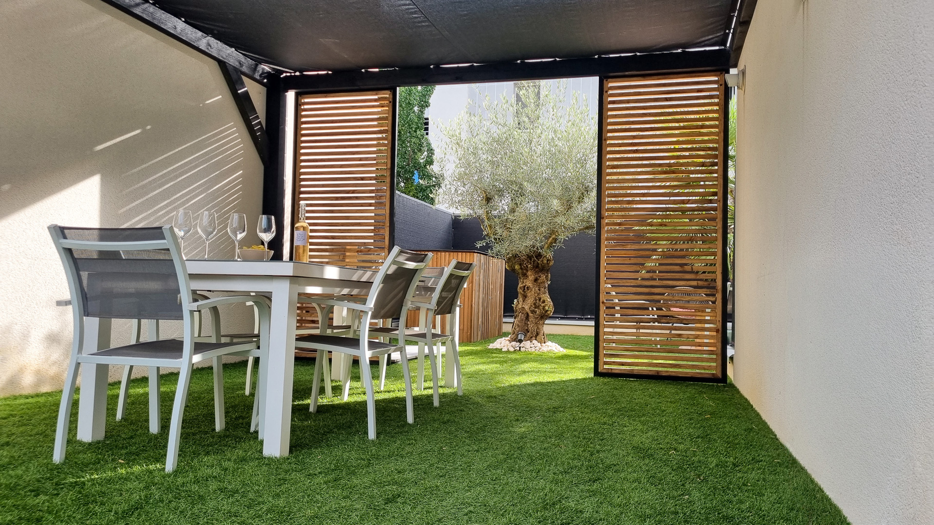 Nous avions dans un premier temps travaillé à l’aménagement complet de ce petit jardin urbain. Sur la base de notre étude paysagère, une piscine coque a été installée, et nous avons créé la plage attenante à la maison. L’espace jardin avait été recouvert de gazon synthétique, et les végétaux déjà présents transplantés. Afin de répondre au souhait de mes clients, j’ai dessiné une pergola occupant les quatre mètres de large de cette bande de jardin. Le bois teinté noir, ainsi que la toile micro-perforée (Serge Ferrari – Soltis 92) en couverture en font un espace intime, et moins bruyant. Nous avons fabriqué à notre atelier des cadres en acier laqués noirs, remplis de tasseaux mélèze en clairevoie. Ces panneaux coulissants le long d’un rail permettent de masquer à loisir les vis à vis depuis l’immeuble voisin. Une casquette brise-soleil, en débord de la structure côté piscine, prolonge avec légèreté la pergola, rendant la transition entre les espaces plus douces à l’œil.