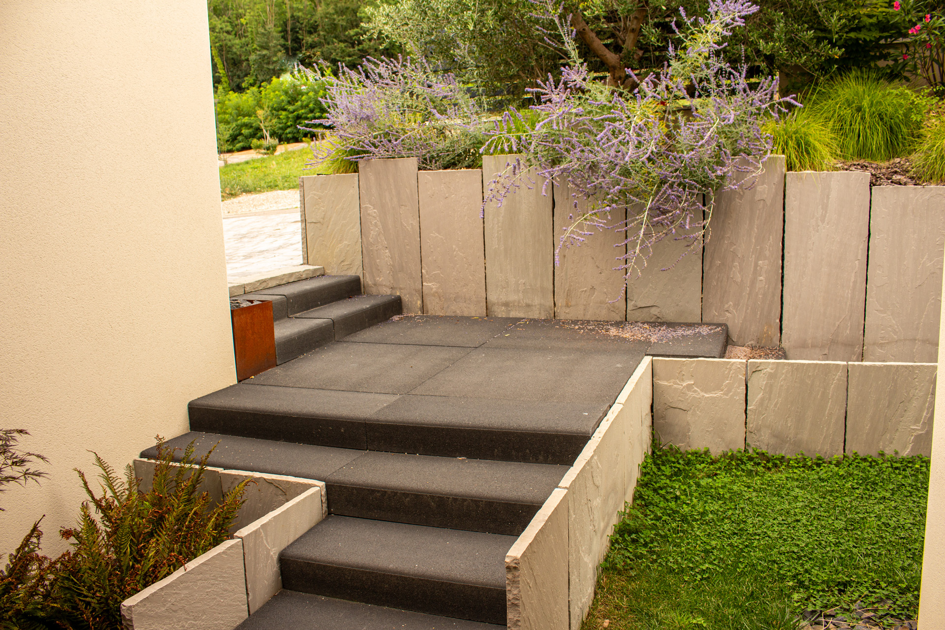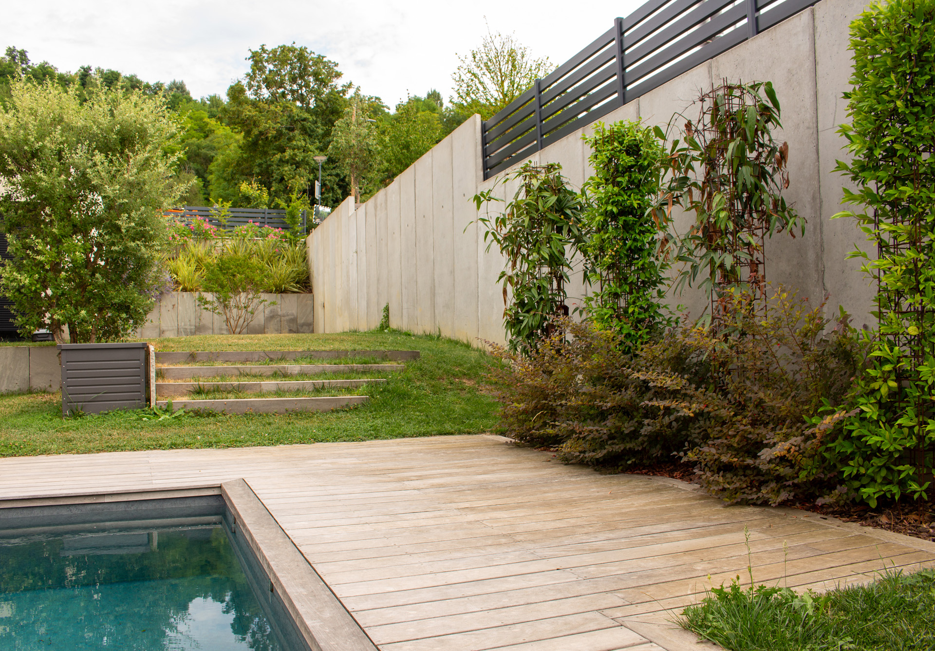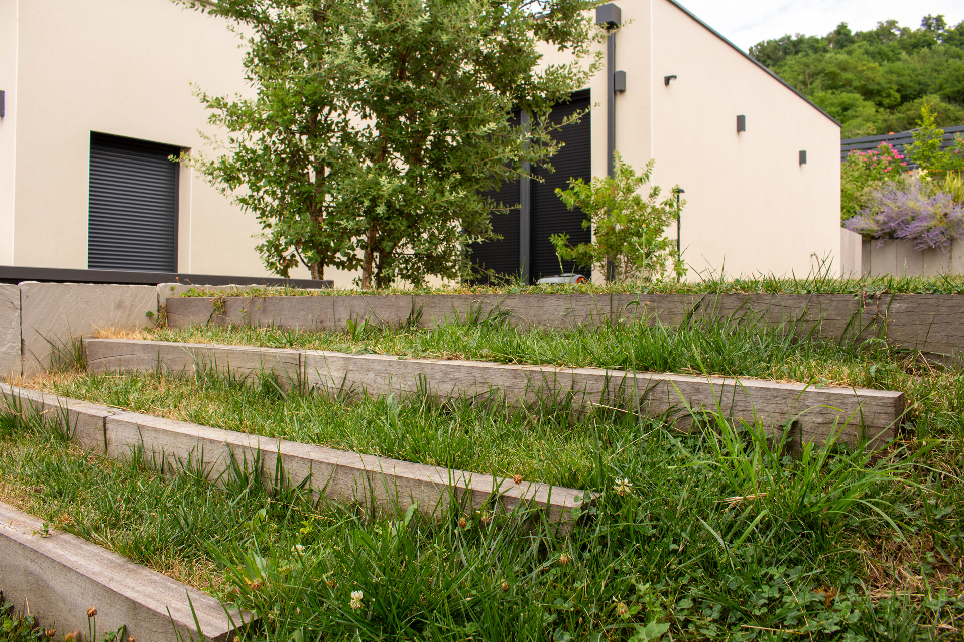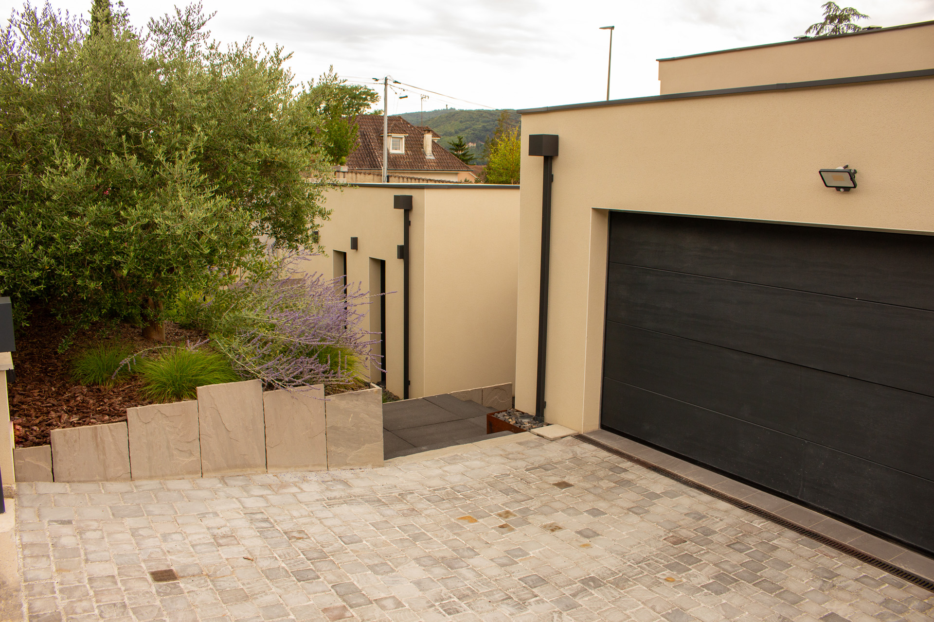 L’emplacement de la piscine ne faisait que peu de doute, ayant été déposée au permis de construire, et la réalisation de la terrasse repas et de la plage de la piscine ne nous ont pas été confiées. Notre étude s’est donc tout d’abord concentrée sur l’habillage en fond de piscine d’un mur de soutènement en béton banché, ainsi que sur la végétalisation du jardin principal. La gestion des différences de niveau a été pensée en plaques de grès gris scellées verticalement, et quelques marches en bois ont été disposées afin de permettre un accès entre les deux niveaux du jardin, Côté entrée, le niveau du terrain, très en contre-bas de la route du lotissement, entrainait la création d’un talus important, empiétant largement sur le terrain exploitable. J’ai donc proposé à mes clients un soutènement de 130cm en grès gris, et une végétalisation du talus, afin de le rendre moins raide, et qu’il prenne moins de place sur le jardin. L’escalier d’accès a été dessiné pour qu’il ouvre à la descente sur la porte de la maison et sur le jardin. Le style contemporain de la maison a été renforcé par l’emploi de dalles et marches massives préfabriquées en béton décoratif. La cohérence avec le reste du jardin se retrouve dans l’utilisation du grès gris en soutènement de l’escalier. Une plate-bande végétale en bas de l’escalier apporte esthétisme et fraîcheur à l’entrée de la maison. Dans un second temps, nous avons réalisé l’accès carrossable au garage en pavés en grès gris, toujours dans la même volonté de respecter l’esprit du jardin.