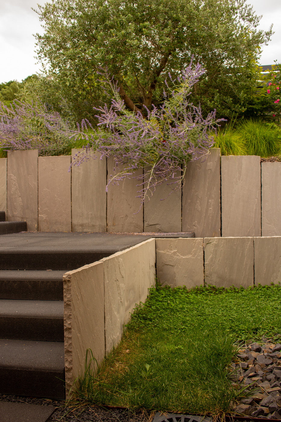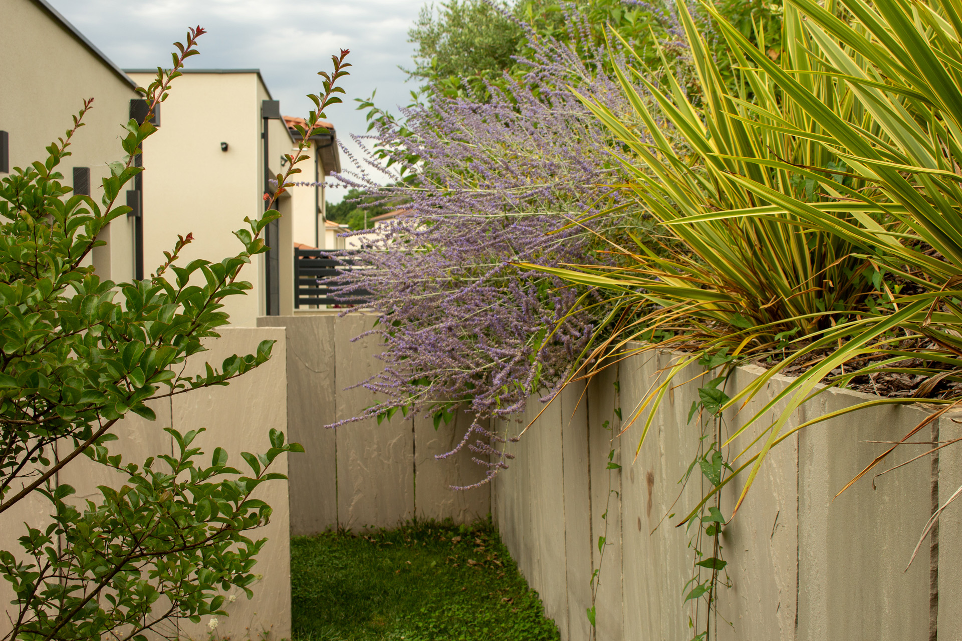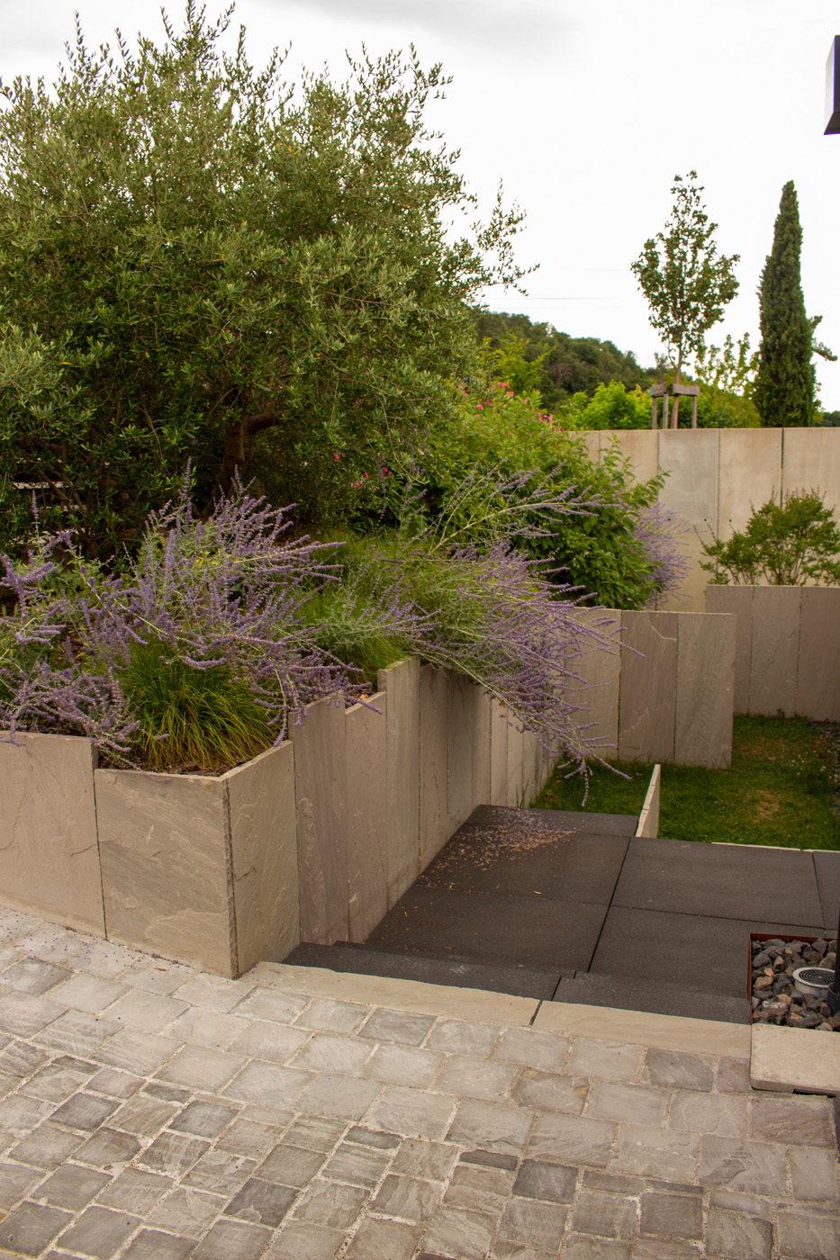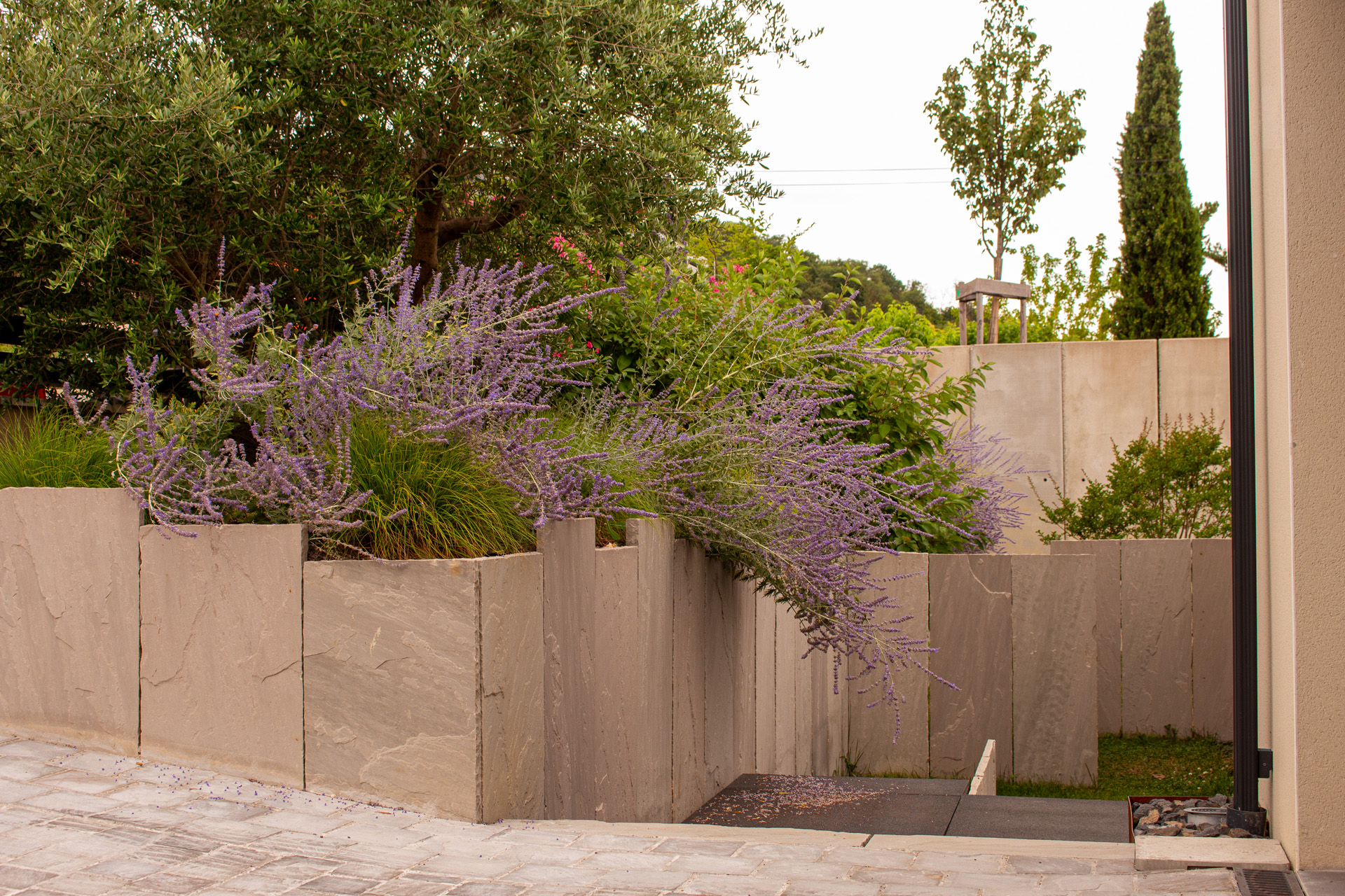 L’emplacement de la piscine ne faisait que peu de doute, ayant été déposée au permis de construire, et la réalisation de la terrasse repas et de la plage de la piscine ne nous ont pas été confiées. Notre étude s’est donc tout d’abord concentrée sur l’habillage en fond de piscine d’un mur de soutènement en béton banché, ainsi que sur la végétalisation du jardin principal. La gestion des différences de niveau a été pensée en plaques de grès gris scellées verticalement, et quelques marches en bois ont été disposées afin de permettre un accès entre les deux niveaux du jardin, Côté entrée, le niveau du terrain, très en contre-bas de la route du lotissement, entrainait la création d’un talus important, empiétant largement sur le terrain exploitable. J’ai donc proposé à mes clients un soutènement de 130cm en grès gris, et une végétalisation du talus, afin de le rendre moins raide, et qu’il prenne moins de place sur le jardin. L’escalier d’accès a été dessiné pour qu’il ouvre à la descente sur la porte de la maison et sur le jardin. Le style contemporain de la maison a été renforcé par l’emploi de dalles et marches massives préfabriquées en béton décoratif. La cohérence avec le reste du jardin se retrouve dans l’utilisation du grès gris en soutènement de l’escalier. Une plate-bande végétale en bas de l’escalier apporte esthétisme et fraîcheur à l’entrée de la maison. Dans un second temps, nous avons réalisé l’accès carrossable au garage en pavés en grès gris, toujours dans la même volonté de respecter l’esprit du jardin.