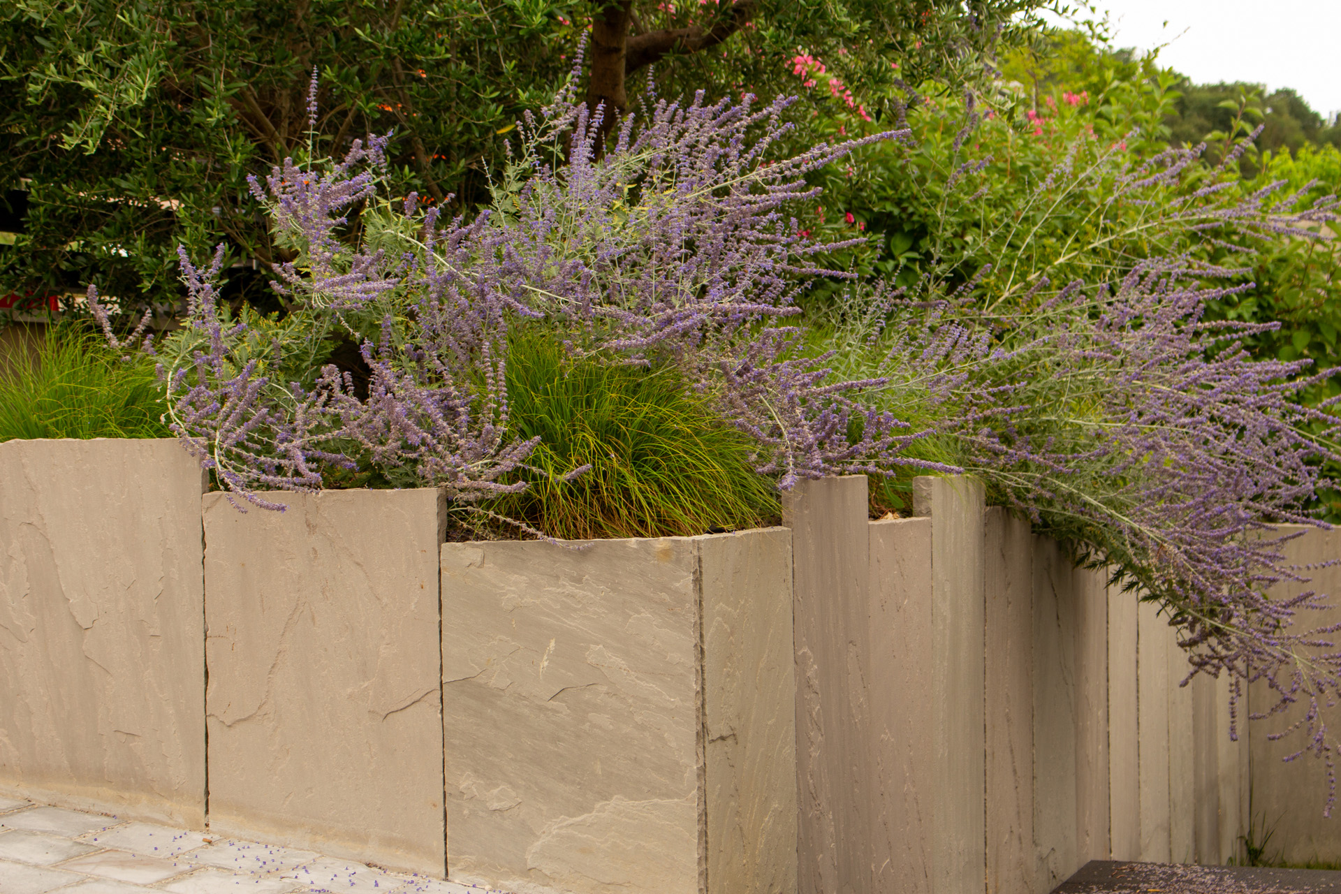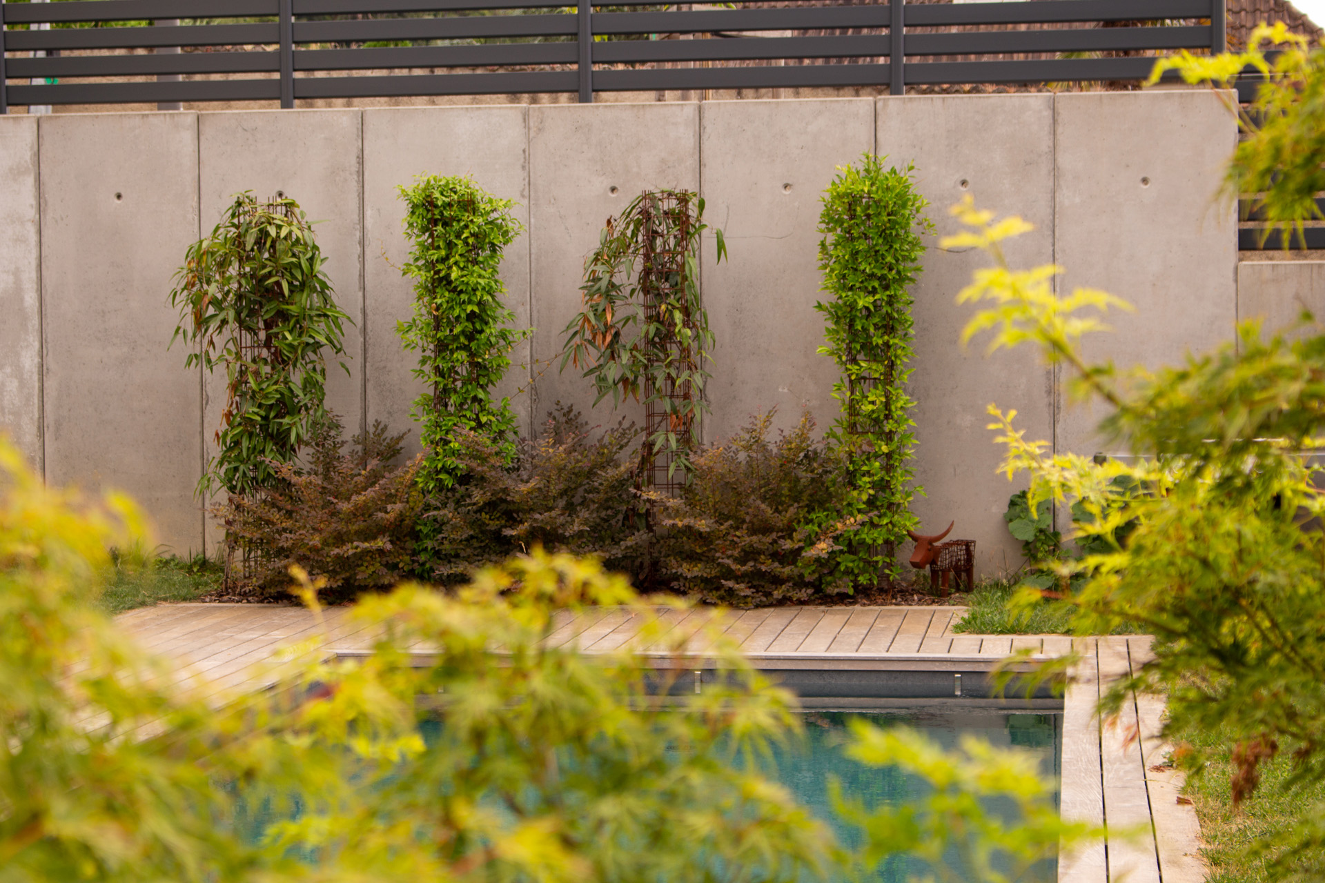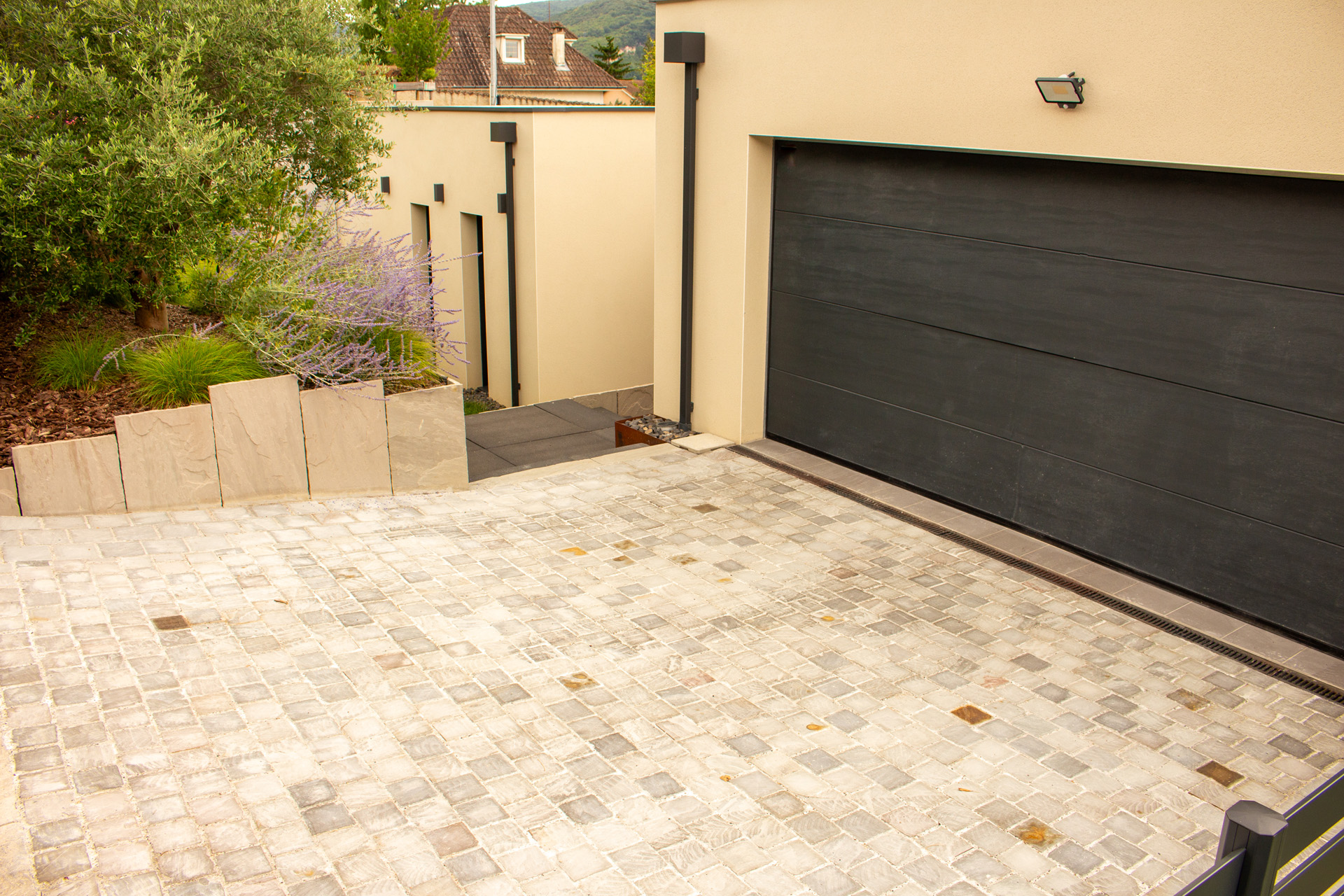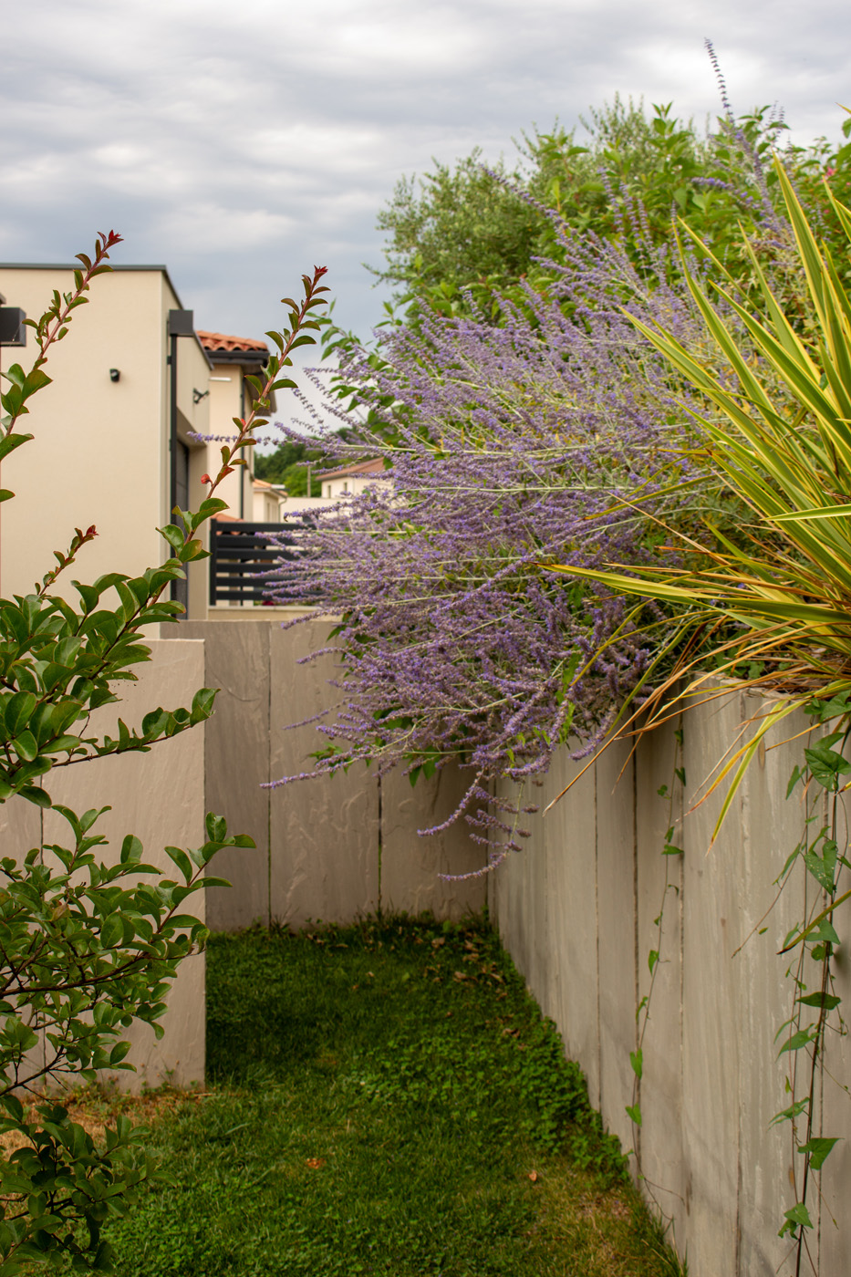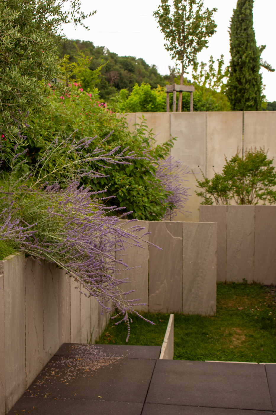 L’emplacement de la piscine ne faisait que peu de doute, ayant été déposée au permis de construire, et la réalisation de la terrasse repas et de la plage de la piscine ne nous ont pas été confiées. Notre étude s’est donc tout d’abord concentrée sur l’habillage en fond de piscine d’un mur de soutènement en béton banché, ainsi que sur la végétalisation du jardin principal. La gestion des différences de niveau a été pensée en plaques de grès gris scellées verticalement, et quelques marches en bois ont été disposées afin de permettre un accès entre les deux niveaux du jardin, Côté entrée, le niveau du terrain, très en contre-bas de la route du lotissement, entrainait la création d’un talus important, empiétant largement sur le terrain exploitable. J’ai donc proposé à mes clients un soutènement de 130cm en grès gris, et une végétalisation du talus, afin de le rendre moins raide, et qu’il prenne moins de place sur le jardin. L’escalier d’accès a été dessiné pour qu’il ouvre à la descente sur la porte de la maison et sur le jardin. Le style contemporain de la maison a été renforcé par l’emploi de dalles et marches massives préfabriquées en béton décoratif. La cohérence avec le reste du jardin se retrouve dans l’utilisation du grès gris en soutènement de l’escalier. Une plate-bande végétale en bas de l’escalier apporte esthétisme et fraîcheur à l’entrée de la maison. Dans un second temps, nous avons réalisé l’accès carrossable au garage en pavés en grès gris, toujours dans la même volonté de respecter l’esprit du jardin.