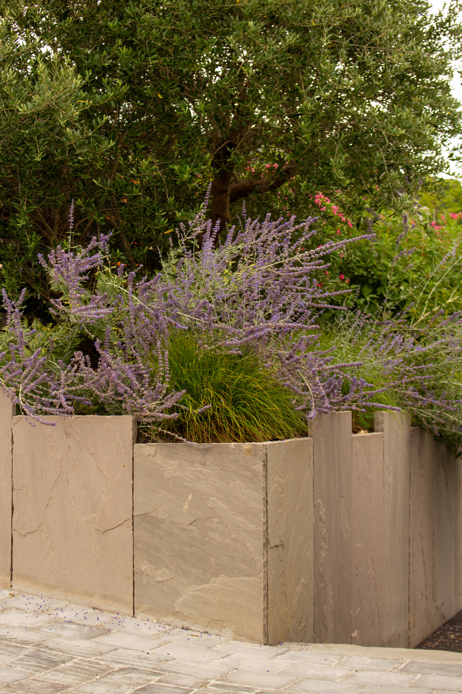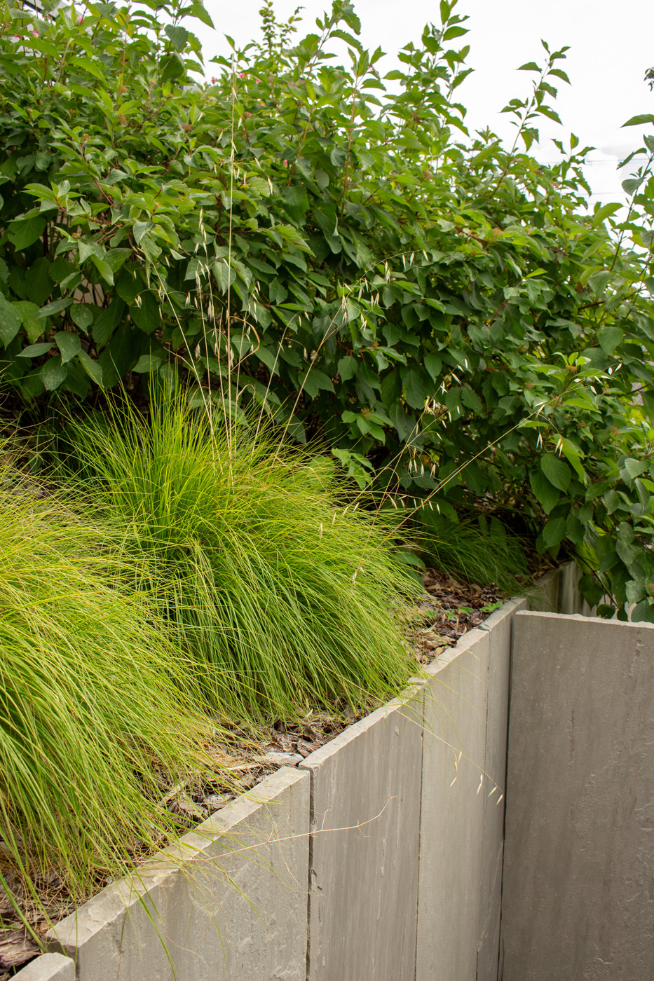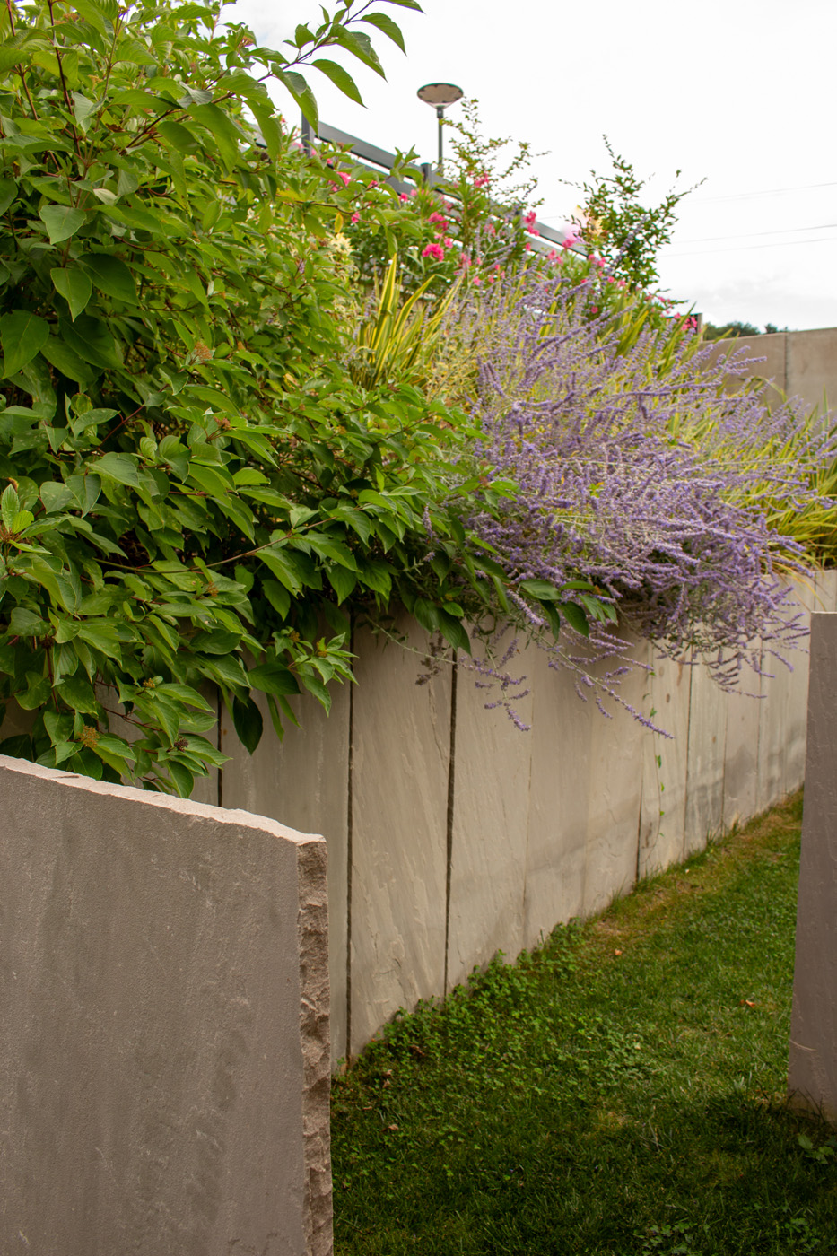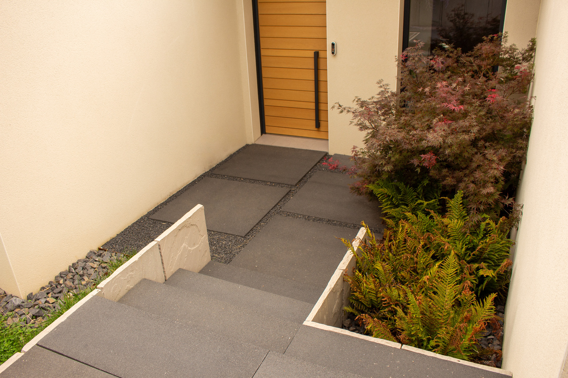 L’emplacement de la piscine ne faisait que peu de doute, ayant été déposée au permis de construire, et la réalisation de la terrasse repas et de la plage de la piscine ne nous ont pas été confiées. Notre étude s’est donc tout d’abord concentrée sur l’habillage en fond de piscine d’un mur de soutènement en béton banché, ainsi que sur la végétalisation du jardin principal. La gestion des différences de niveau a été pensée en plaques de grès gris scellées verticalement, et quelques marches en bois ont été disposées afin de permettre un accès entre les deux niveaux du jardin, Côté entrée, le niveau du terrain, très en contre-bas de la route du lotissement, entrainait la création d’un talus important, empiétant largement sur le terrain exploitable. J’ai donc proposé à mes clients un soutènement de 130cm en grès gris, et une végétalisation du talus, afin de le rendre moins raide, et qu’il prenne moins de place sur le jardin. L’escalier d’accès a été dessiné pour qu’il ouvre à la descente sur la porte de la maison et sur le jardin. Le style contemporain de la maison a été renforcé par l’emploi de dalles et marches massives préfabriquées en béton décoratif. La cohérence avec le reste du jardin se retrouve dans l’utilisation du grès gris en soutènement de l’escalier. Une plate-bande végétale en bas de l’escalier apporte esthétisme et fraîcheur à l’entrée de la maison. Dans un second temps, nous avons réalisé l’accès carrossable au garage en pavés en grès gris, toujours dans la même volonté de respecter l’esprit du jardin.