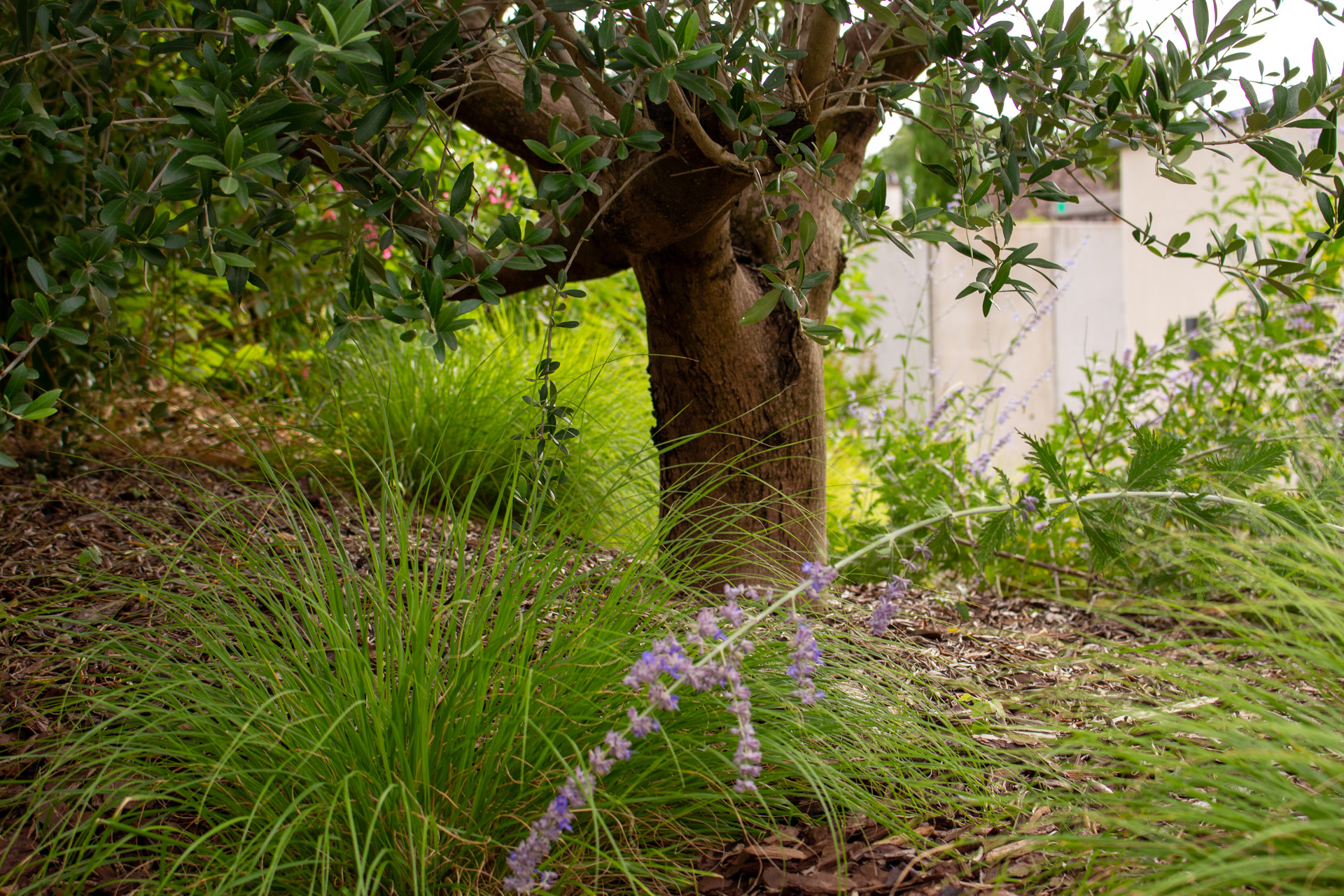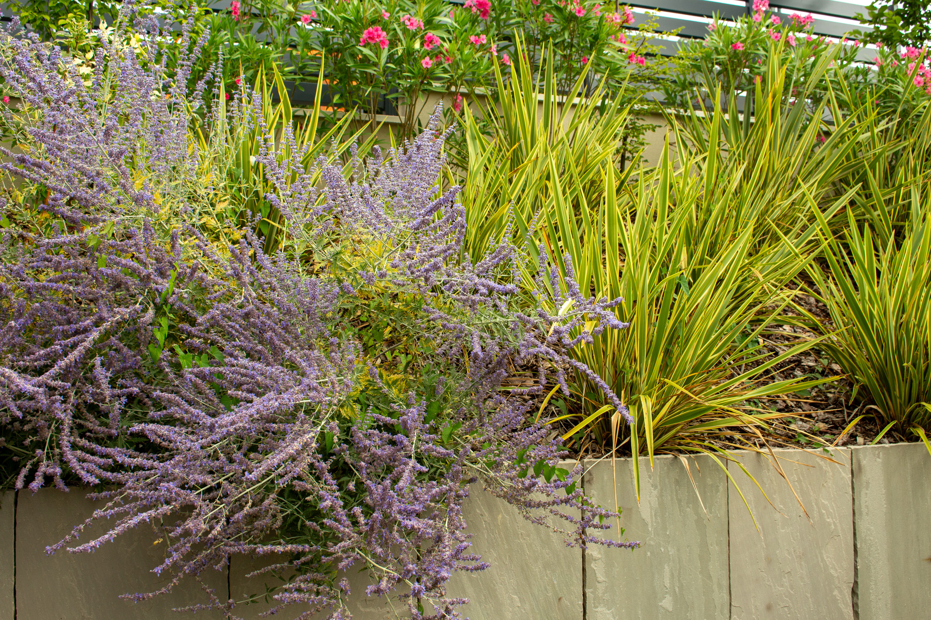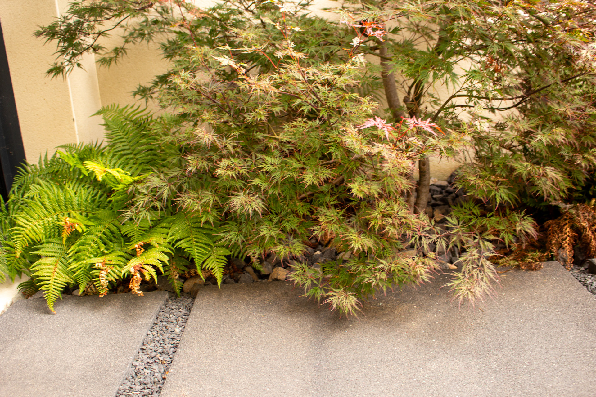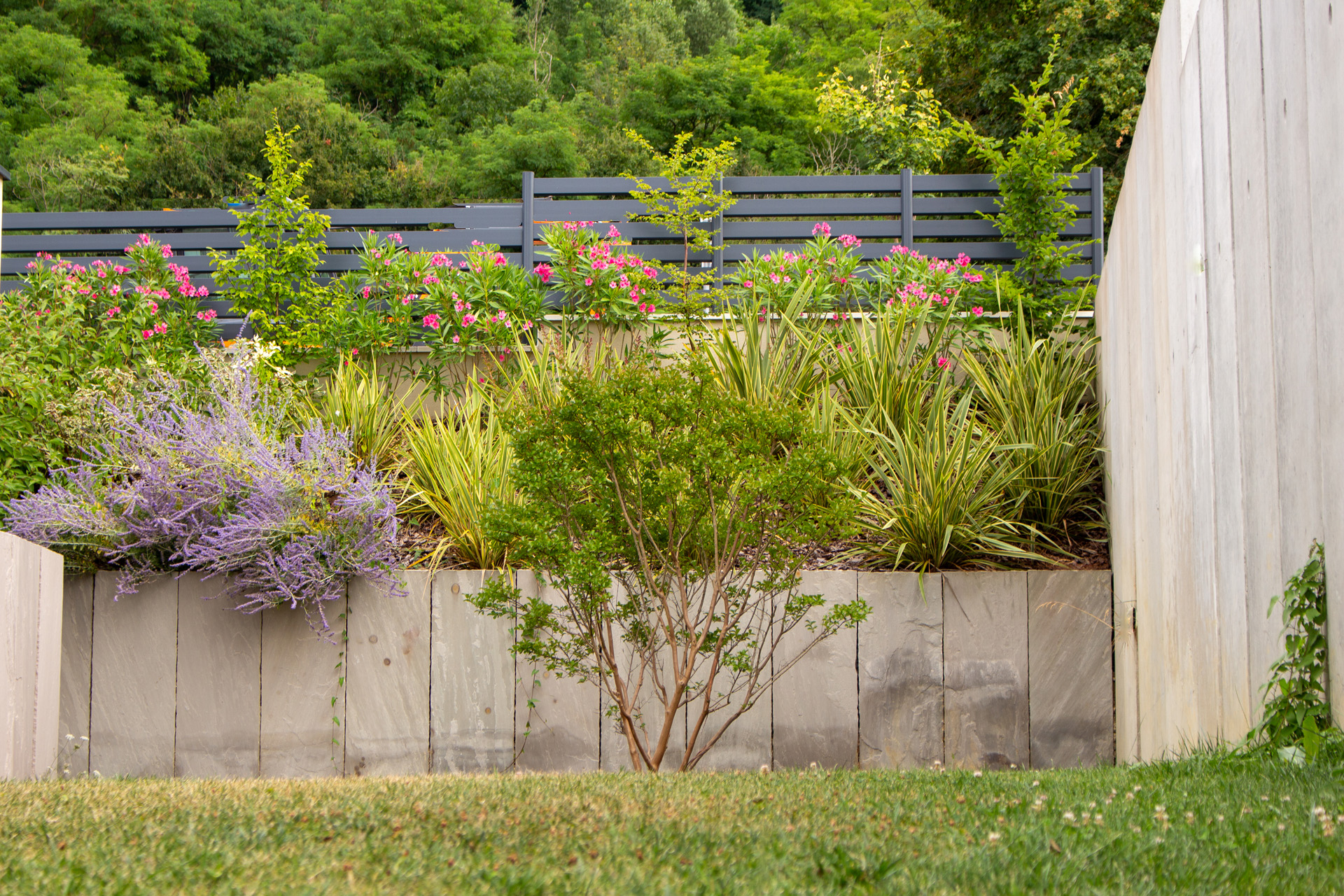 L’emplacement de la piscine ne faisait que peu de doute, ayant été déposée au permis de construire, et la réalisation de la terrasse repas et de la plage de la piscine ne nous ont pas été confiées. Notre étude s’est donc tout d’abord concentrée sur l’habillage en fond de piscine d’un mur de soutènement en béton banché, ainsi que sur la végétalisation du jardin principal. La gestion des différences de niveau a été pensée en plaques de grès gris scellées verticalement, et quelques marches en bois ont été disposées afin de permettre un accès entre les deux niveaux du jardin, Côté entrée, le niveau du terrain, très en contre-bas de la route du lotissement, entrainait la création d’un talus important, empiétant largement sur le terrain exploitable. J’ai donc proposé à mes clients un soutènement de 130cm en grès gris, et une végétalisation du talus, afin de le rendre moins raide, et qu’il prenne moins de place sur le jardin. L’escalier d’accès a été dessiné pour qu’il ouvre à la descente sur la porte de la maison et sur le jardin. Le style contemporain de la maison a été renforcé par l’emploi de dalles et marches massives préfabriquées en béton décoratif. La cohérence avec le reste du jardin se retrouve dans l’utilisation du grès gris en soutènement de l’escalier. Une plate-bande végétale en bas de l’escalier apporte esthétisme et fraîcheur à l’entrée de la maison. Dans un second temps, nous avons réalisé l’accès carrossable au garage en pavés en grès gris, toujours dans la même volonté de respecter l’esprit du jardin.