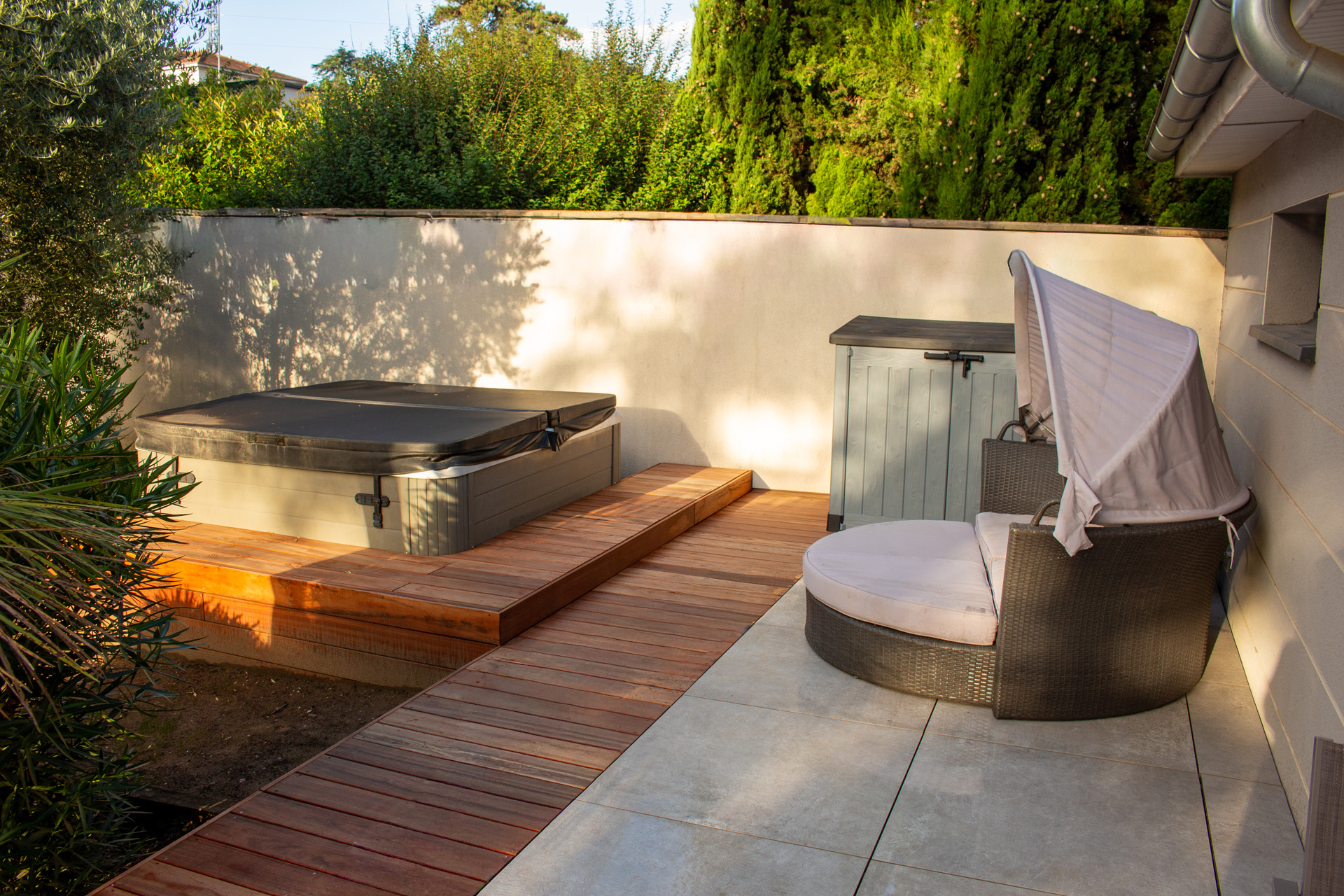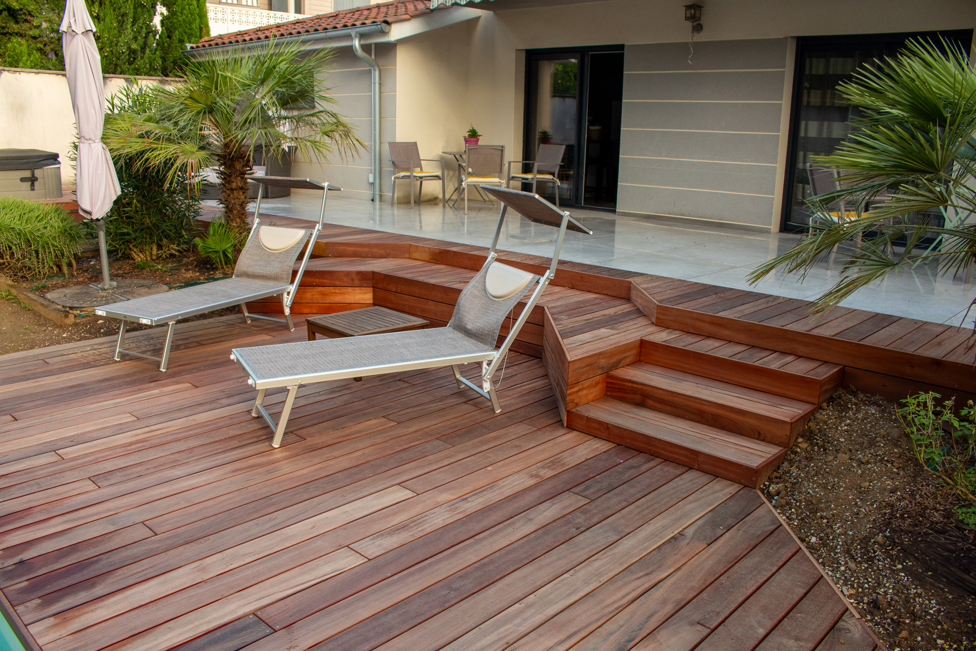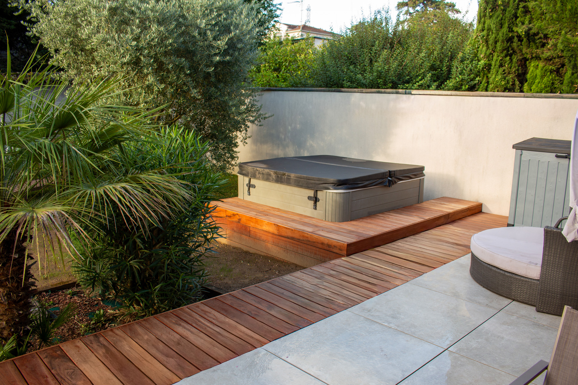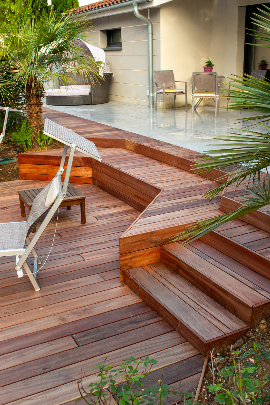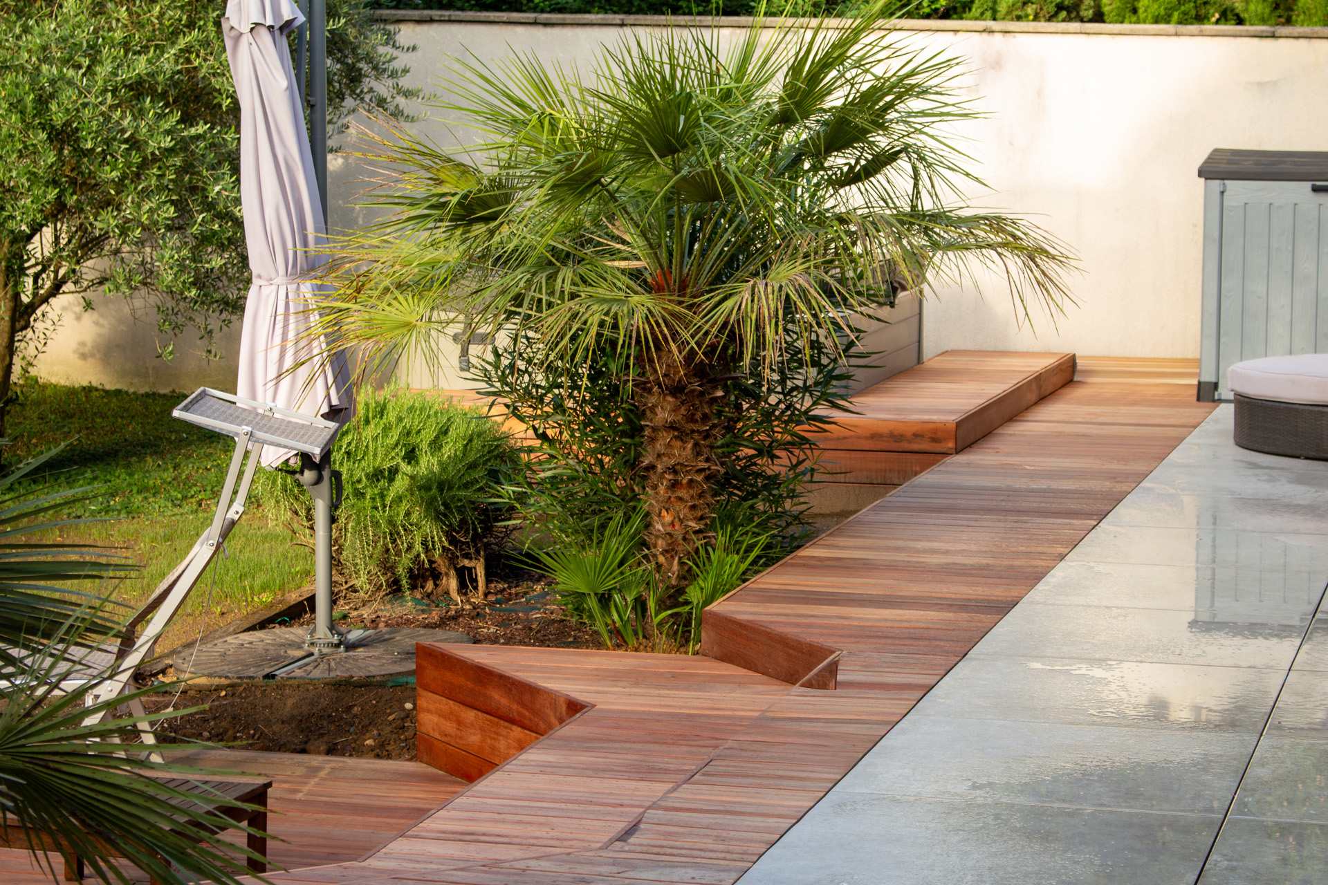Dans un soucis de facilité d’entretien et de durabilité, mon choix s’est porté sur le grès cérame pour la terrasse principale. Le prolongement de cette terrasse en bois exotique (Muiracatiara / Tiger Wood) permet de repenser l’accès la piscine en créant banquettes et escaliers, créant ainsi un espace de vie entre maison et plage. Des margelles épaisses en travertin font ressortir la piscine, lui conférant un aspect bassin traditionnel, cohérent avec l’environnement architectural et végétal du jardin. Le tour du spa a été repensé pour permettre un accès plus ergonomique au bassin, et un accès simplifié à son appareillage technique, grâce un une construction de la structure en éléments amovibles, et aux caillebotis bois en couverture.