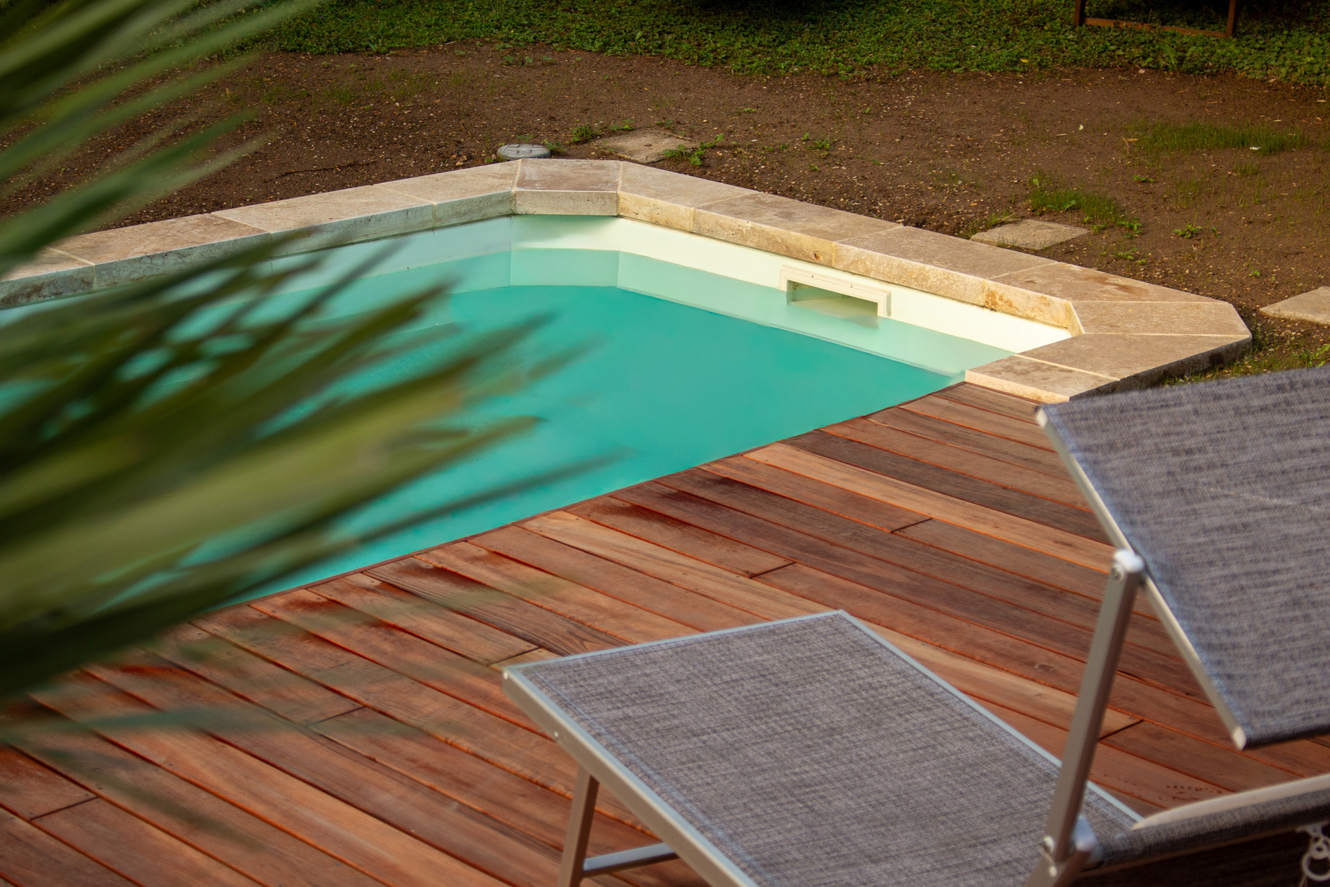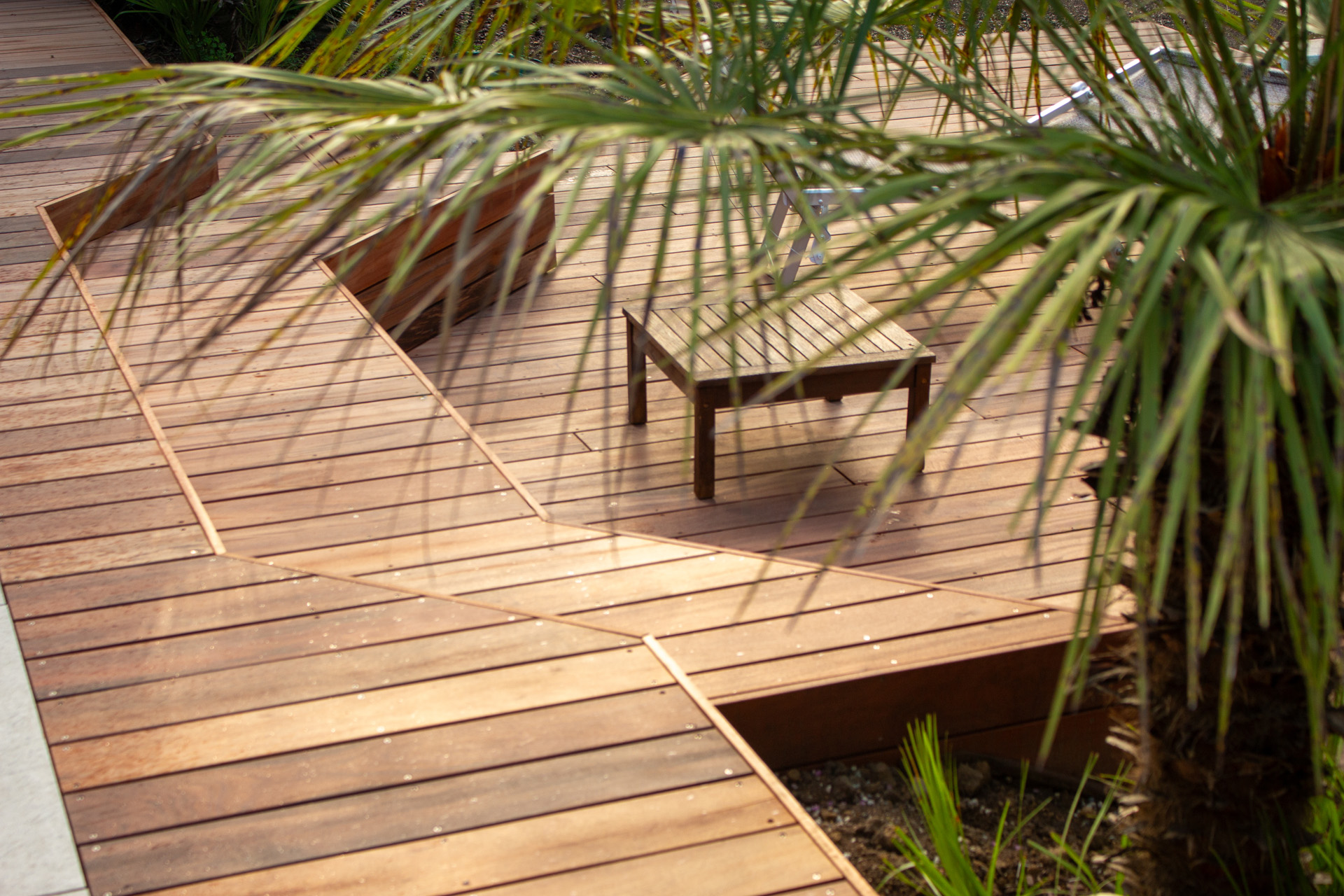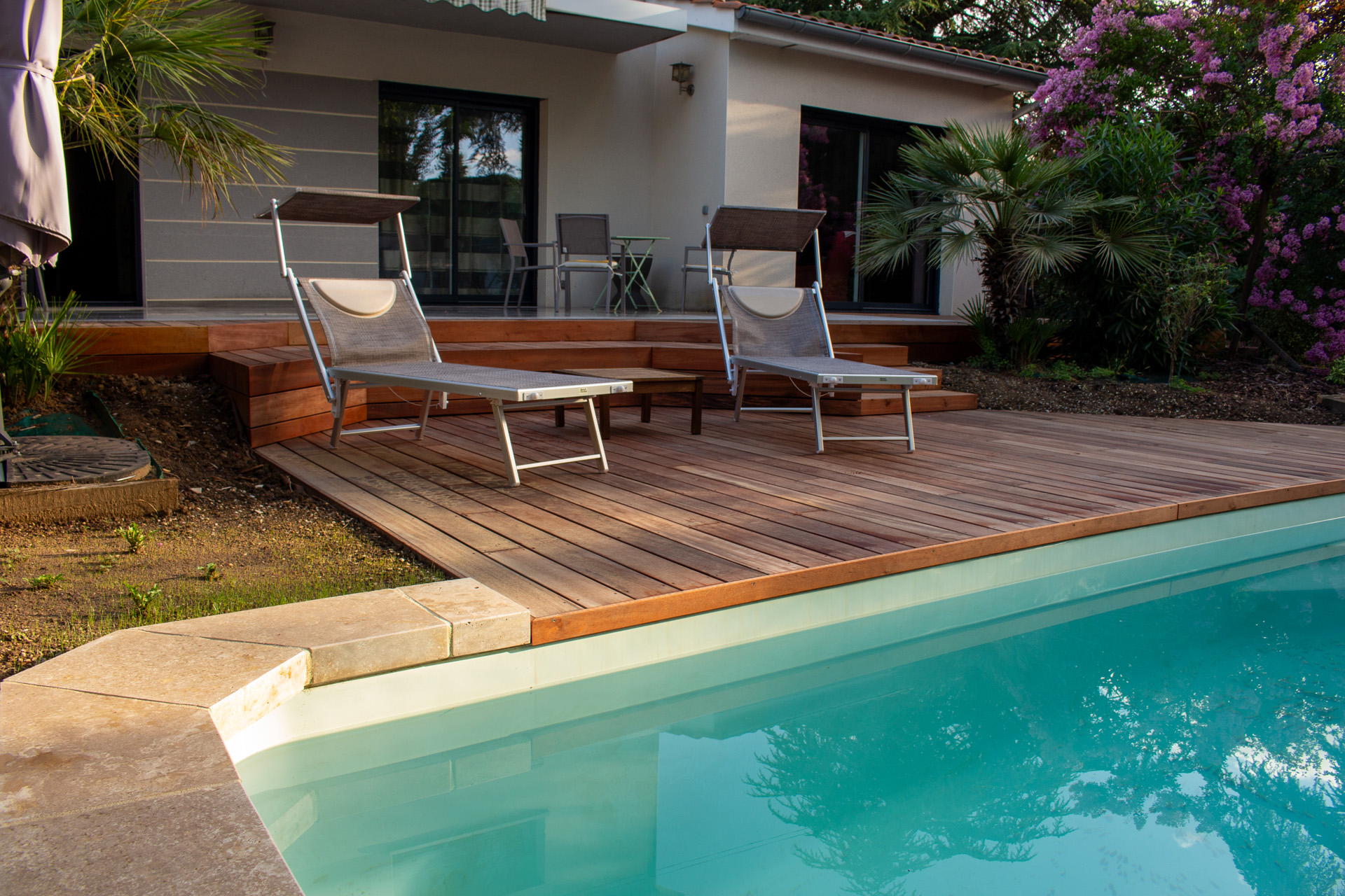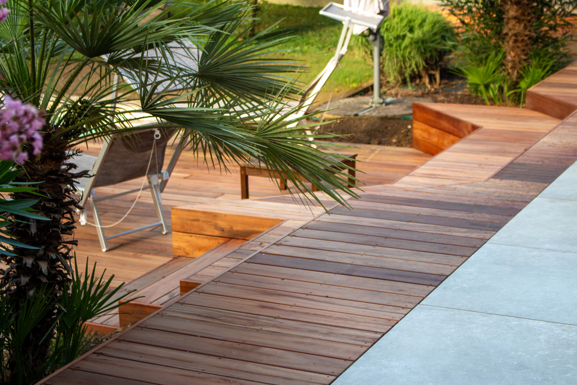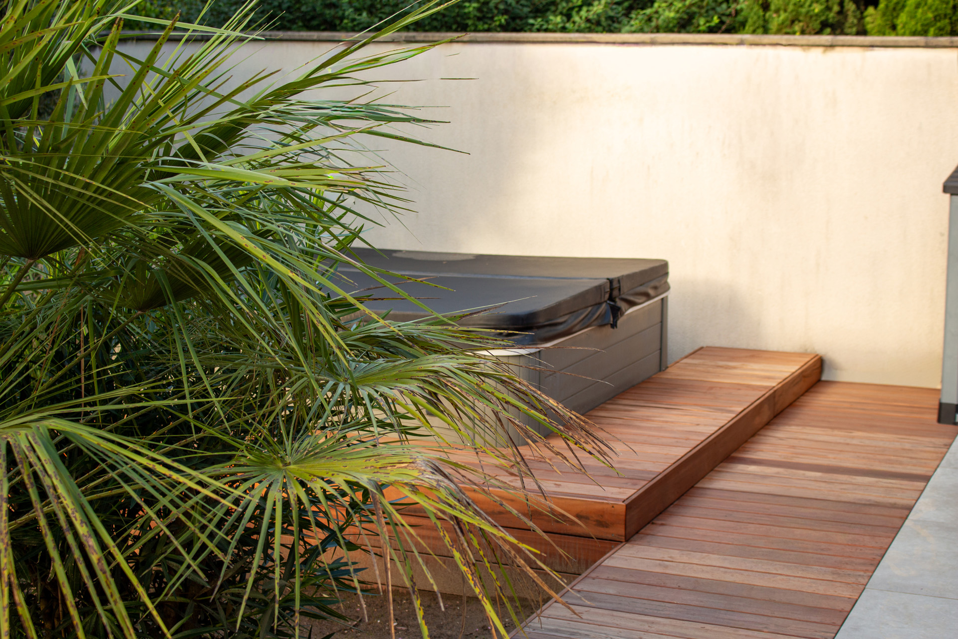 Dans un soucis de facilité d’entretien et de durabilité, mon choix s’est porté sur le grès cérame pour la terrasse principale. Le prolongement de cette terrasse en bois exotique (Muiracatiara / Tiger Wood) permet de repenser l’accès la piscine en créant banquettes et escaliers, créant ainsi un espace de vie entre maison et plage. Des margelles épaisses en travertin font ressortir la piscine, lui conférant un aspect bassin traditionnel, cohérent avec l’environnement architectural et végétal du jardin. Le tour du spa a été repensé pour permettre un accès plus ergonomique au bassin, et un accès simplifié à son appareillage technique, grâce un une construction de la structure en éléments amovibles, et aux caillebotis bois en couverture.