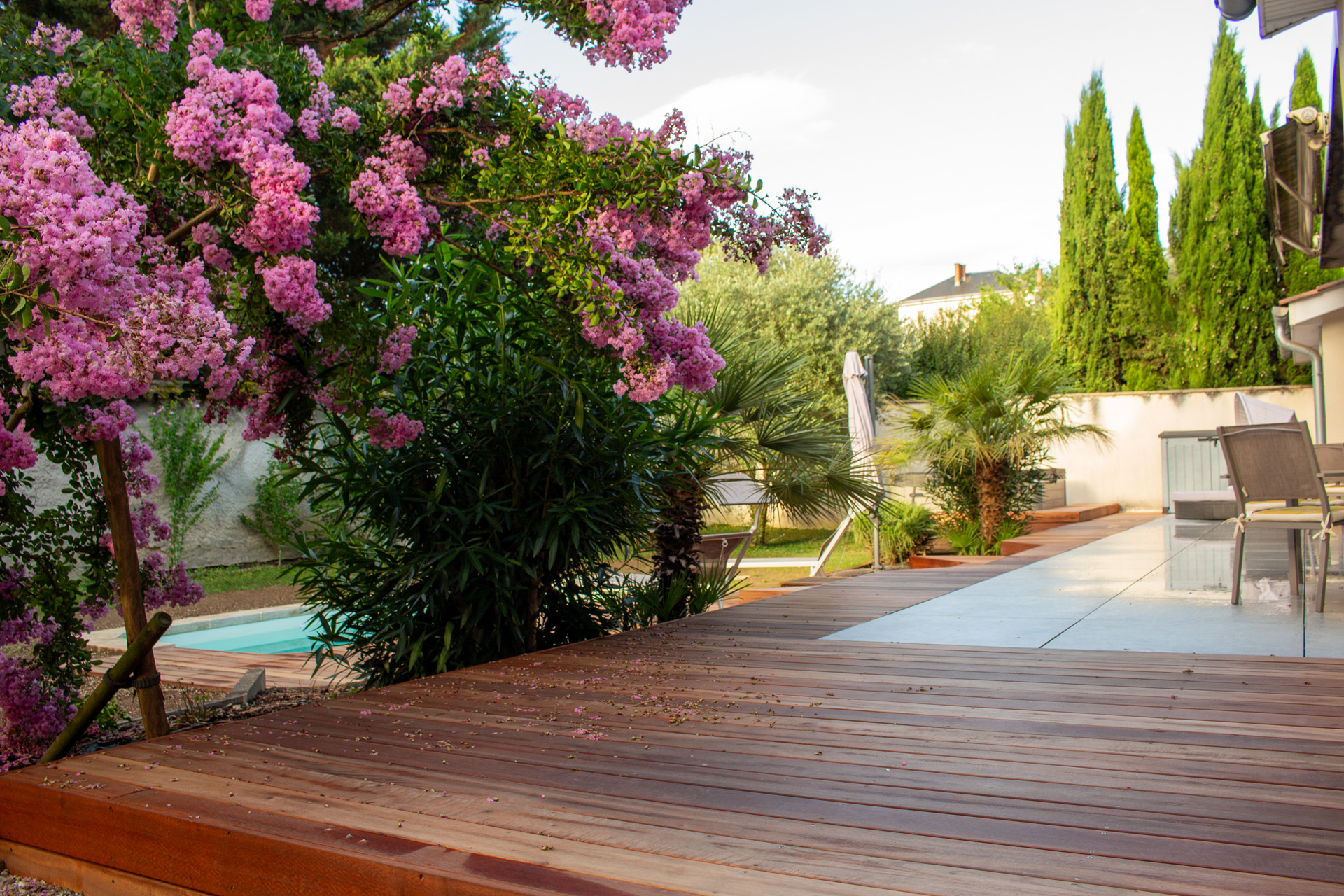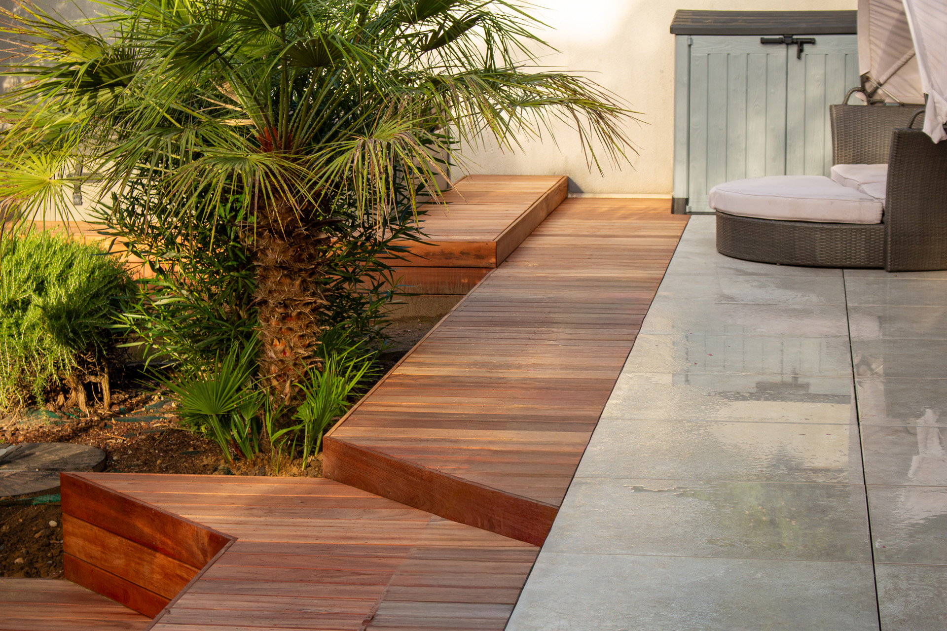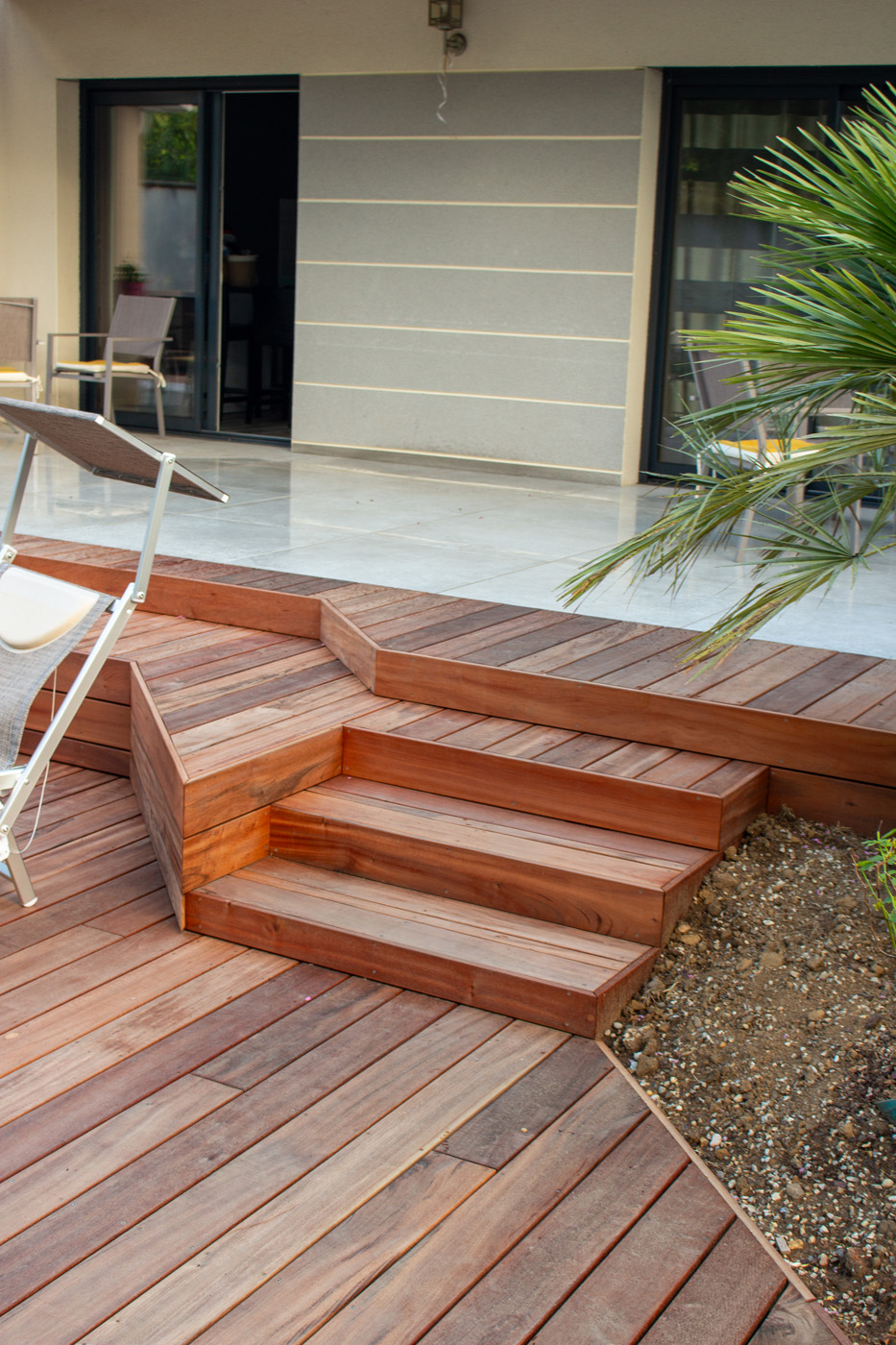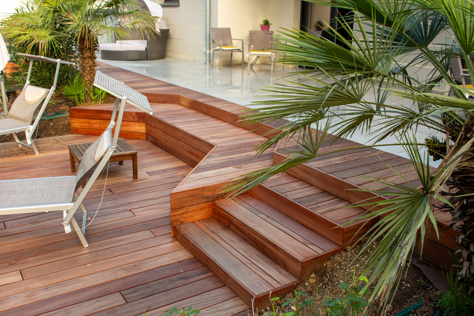 Dans un soucis de facilité d’entretien et de durabilité, mon choix s’est porté sur le grès cérame pour la terrasse principale. Le prolongement de cette terrasse en bois exotique (Muiracatiara / Tiger Wood) permet de repenser l’accès la piscine en créant banquettes et escaliers, créant ainsi un espace de vie entre maison et plage. Des margelles épaisses en travertin font ressortir la piscine, lui conférant un aspect bassin traditionnel, cohérent avec l’environnement architectural et végétal du jardin. Le tour du spa a été repensé pour permettre un accès plus ergonomique au bassin, et un accès simplifié à son appareillage technique, grâce un une construction de la structure en éléments amovibles, et aux caillebotis bois en couverture.