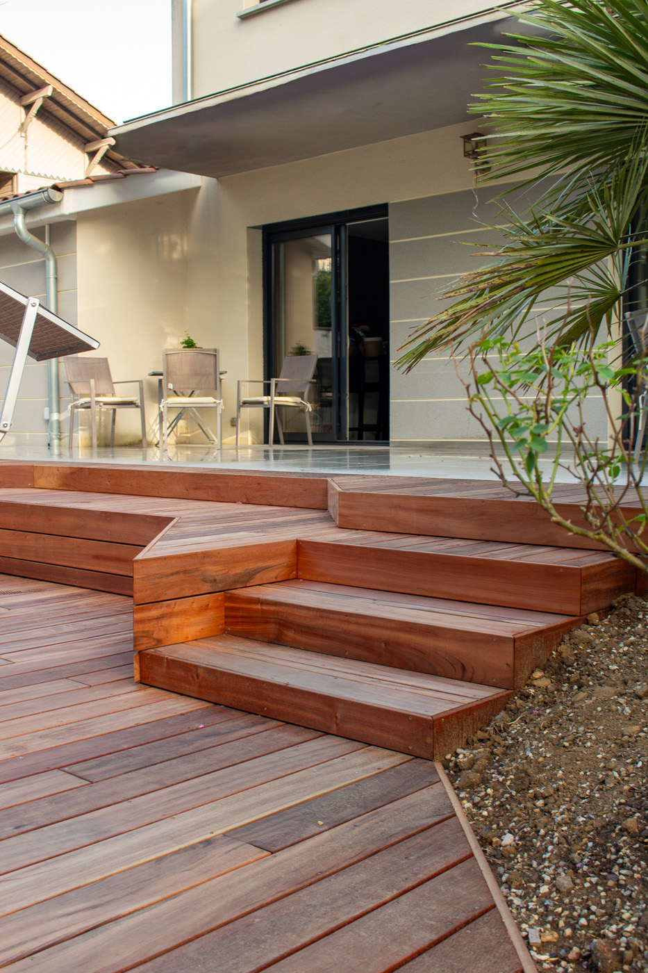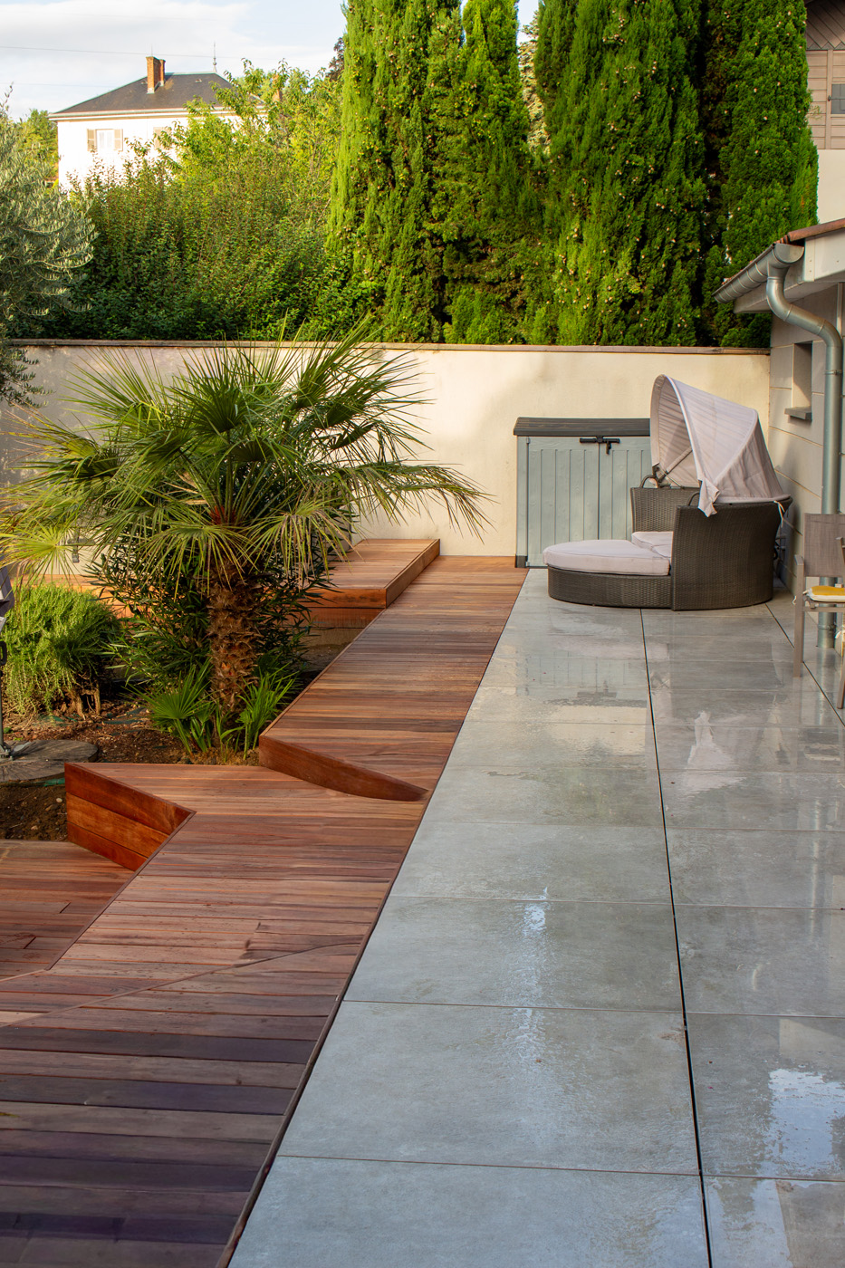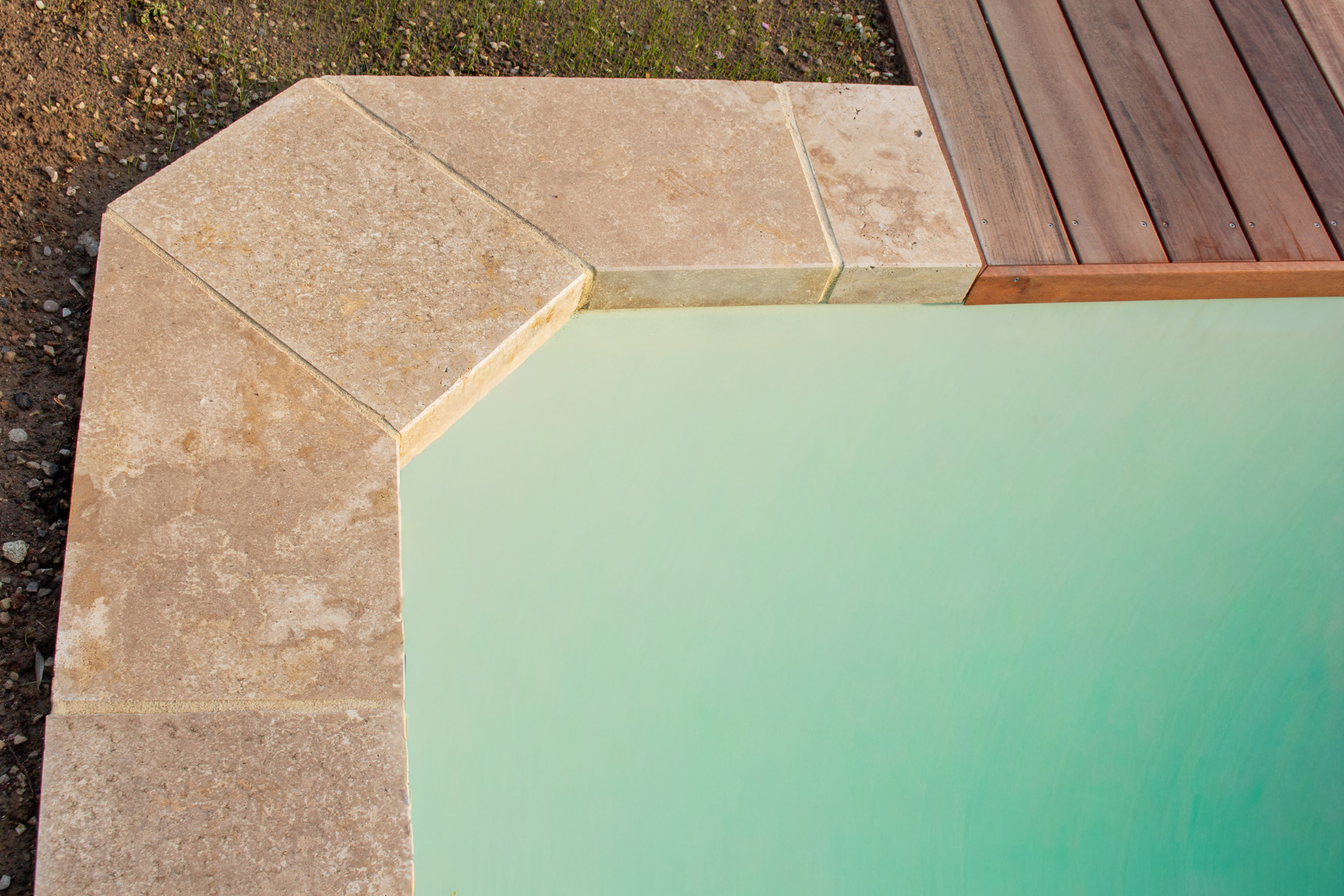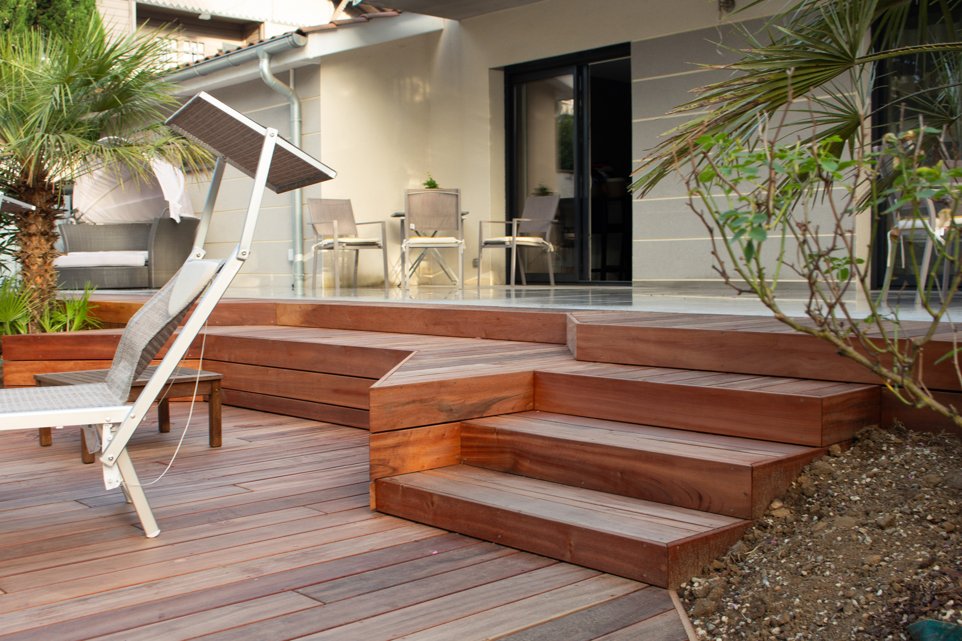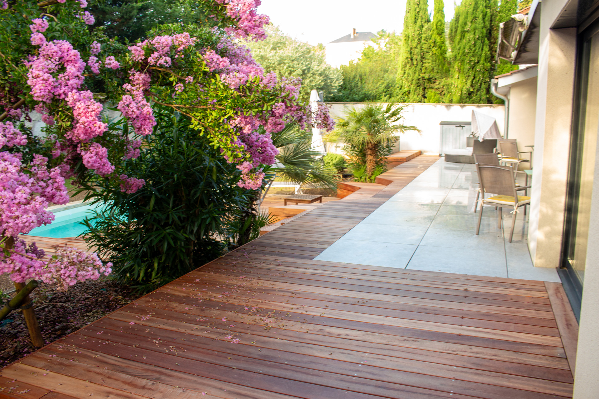 Dans un soucis de facilité d’entretien et de durabilité, mon choix s’est porté sur le grès cérame pour la terrasse principale. Le prolongement de cette terrasse en bois exotique (Muiracatiara / Tiger Wood) permet de repenser l’accès la piscine en créant banquettes et escaliers, créant ainsi un espace de vie entre maison et plage. Des margelles épaisses en travertin font ressortir la piscine, lui conférant un aspect bassin traditionnel, cohérent avec l’environnement architectural et végétal du jardin. Le tour du spa a été repensé pour permettre un accès plus ergonomique au bassin, et un accès simplifié à son appareillage technique, grâce un une construction de la structure en éléments amovibles, et aux caillebotis bois en couverture.
