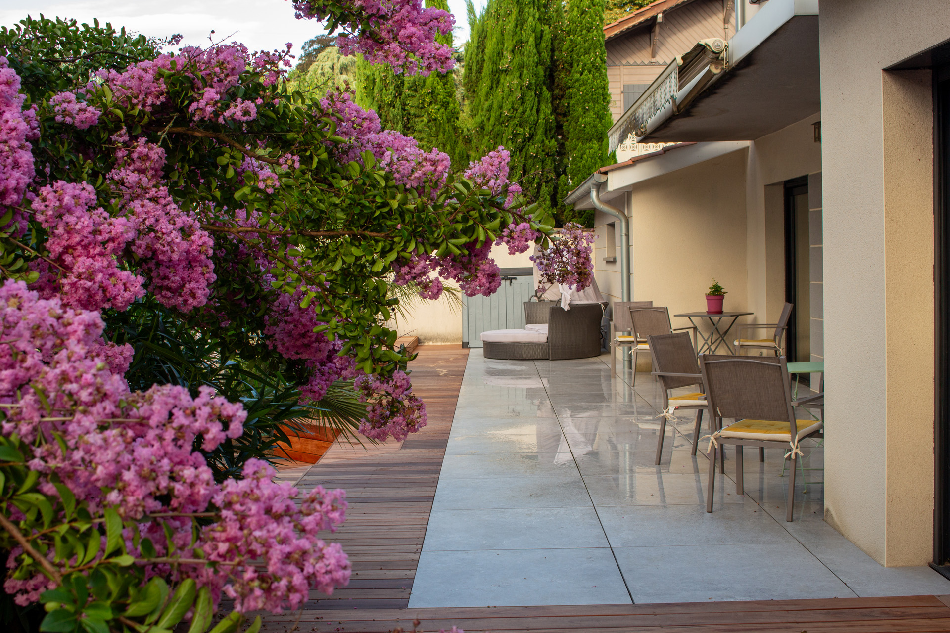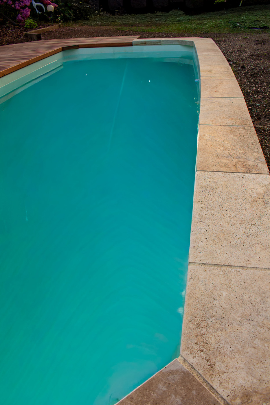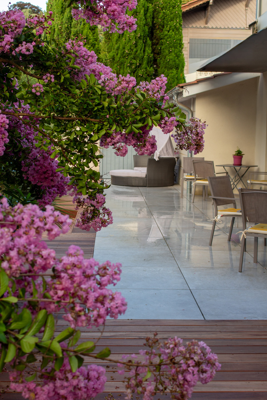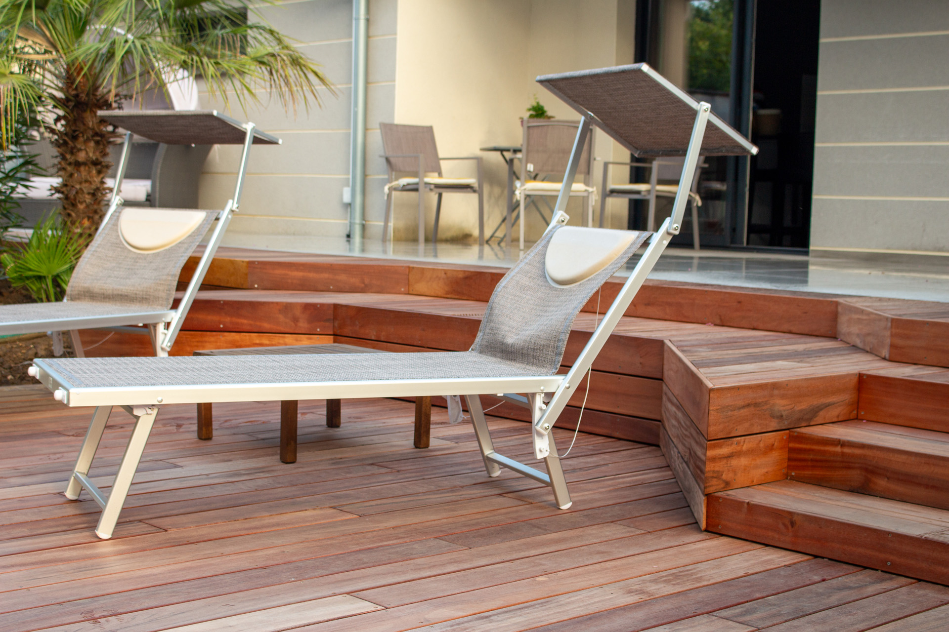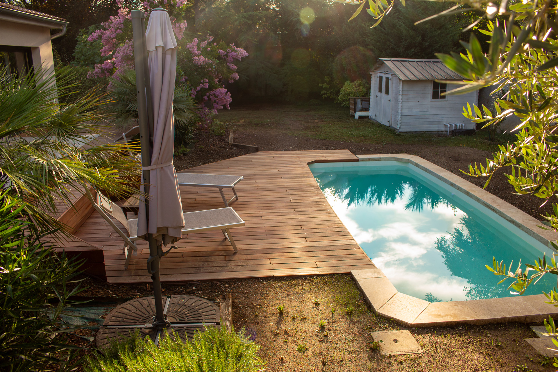 Dans un soucis de facilité d’entretien et de durabilité, mon choix s’est porté sur le grès cérame pour la terrasse principale. Le prolongement de cette terrasse en bois exotique (Muiracatiara / Tiger Wood) permet de repenser l’accès la piscine en créant banquettes et escaliers, créant ainsi un espace de vie entre maison et plage. Des margelles épaisses en travertin font ressortir la piscine, lui conférant un aspect bassin traditionnel, cohérent avec l’environnement architectural et végétal du jardin. Le tour du spa a été repensé pour permettre un accès plus ergonomique au bassin, et un accès simplifié à son appareillage technique, grâce un une construction de la structure en éléments amovibles, et aux caillebotis bois en couverture.