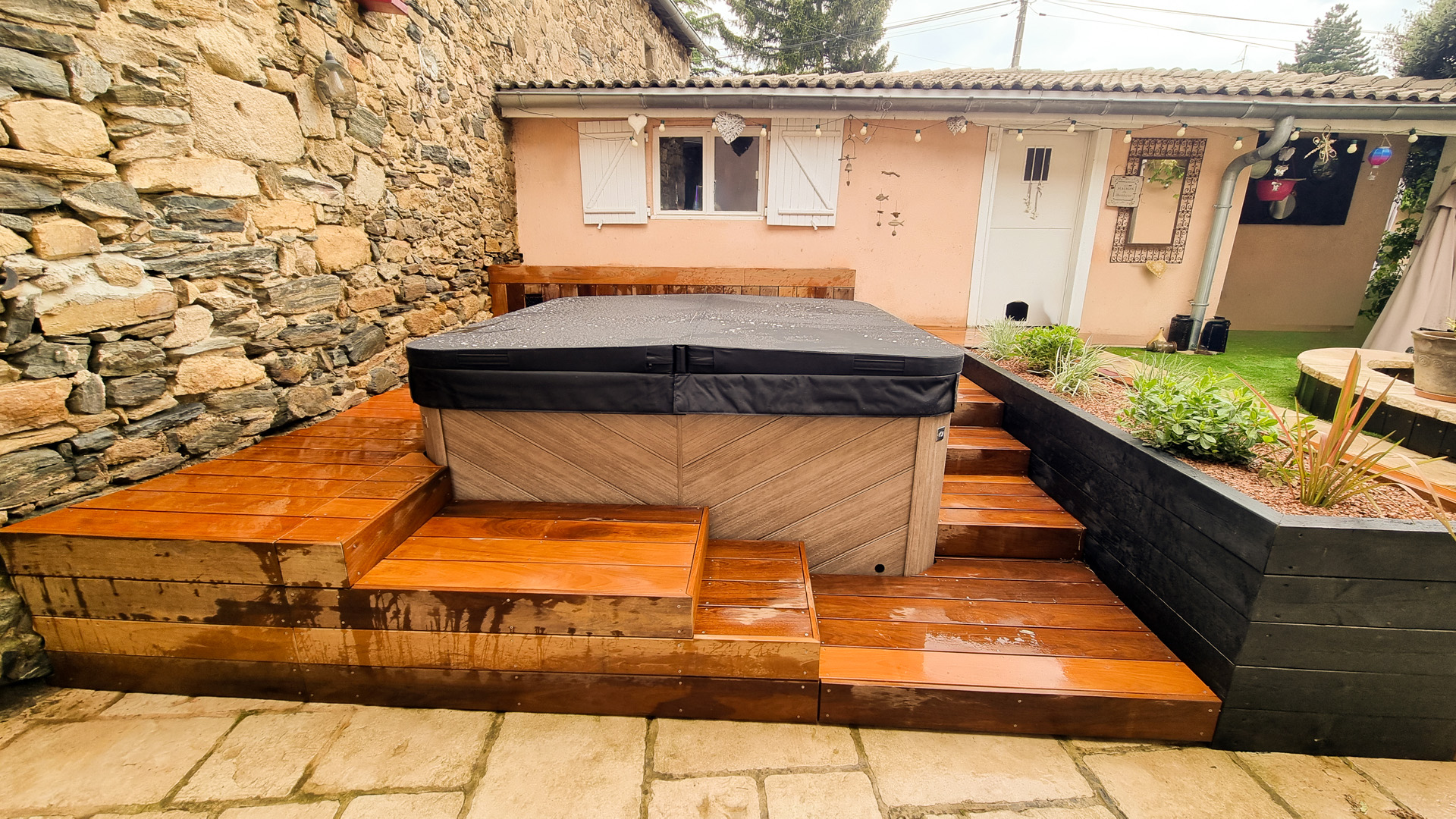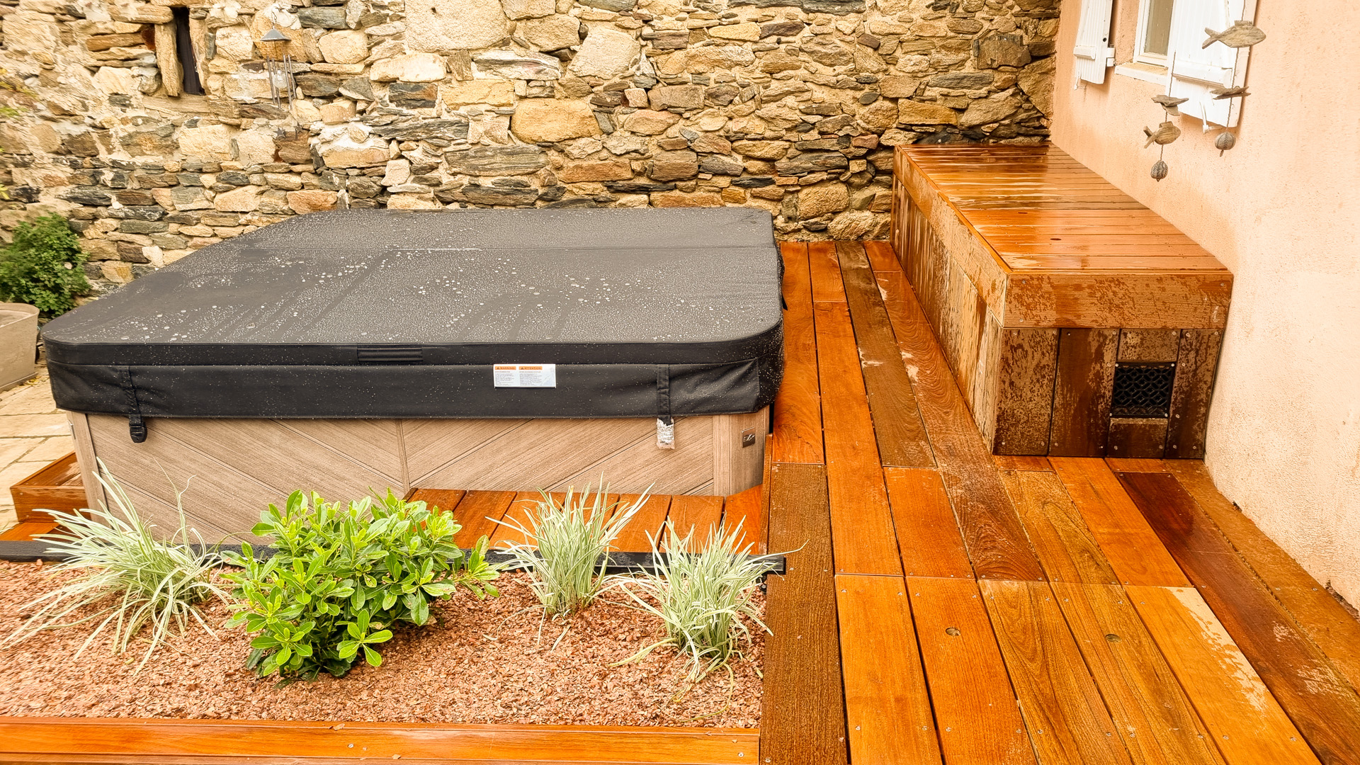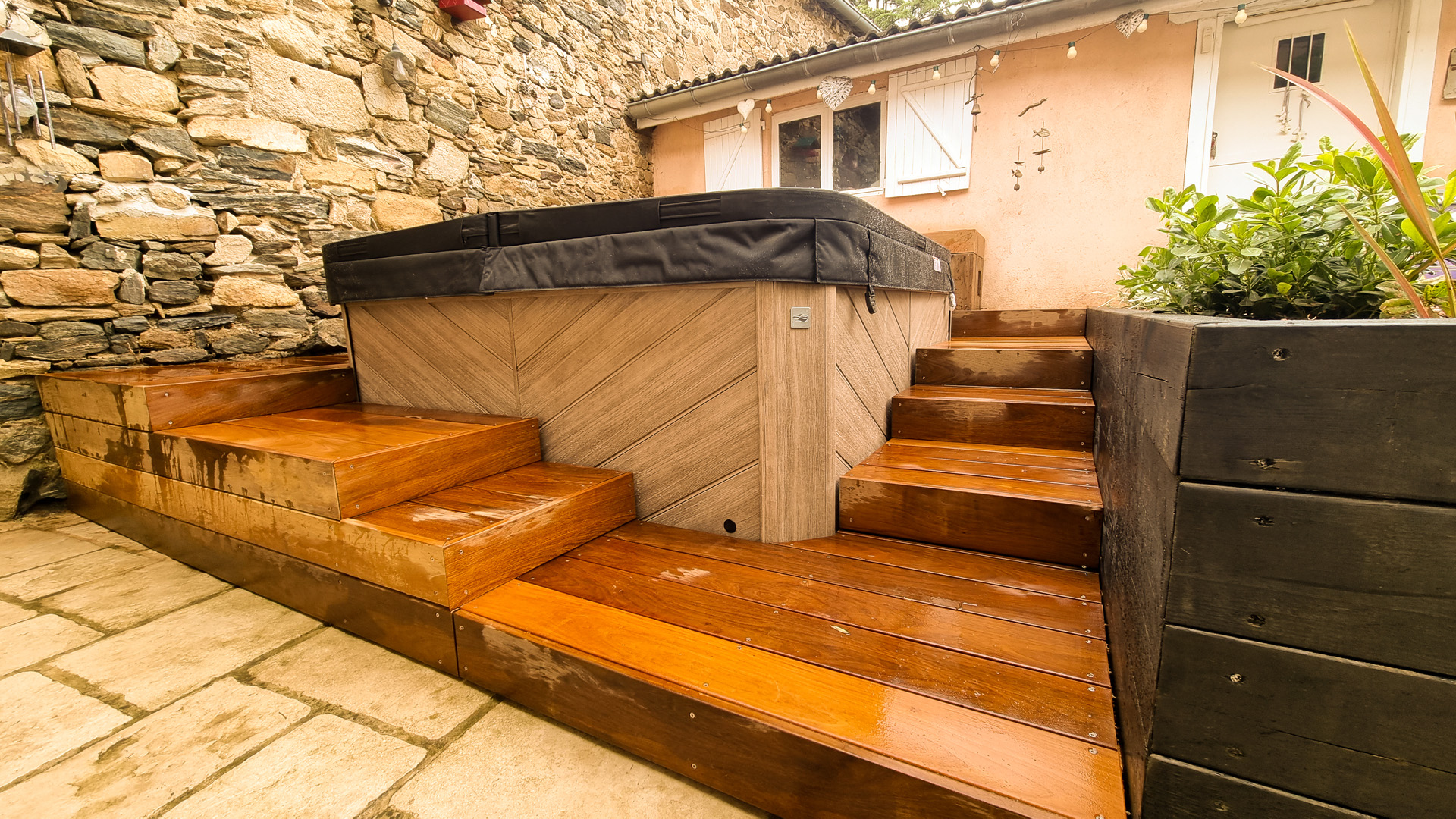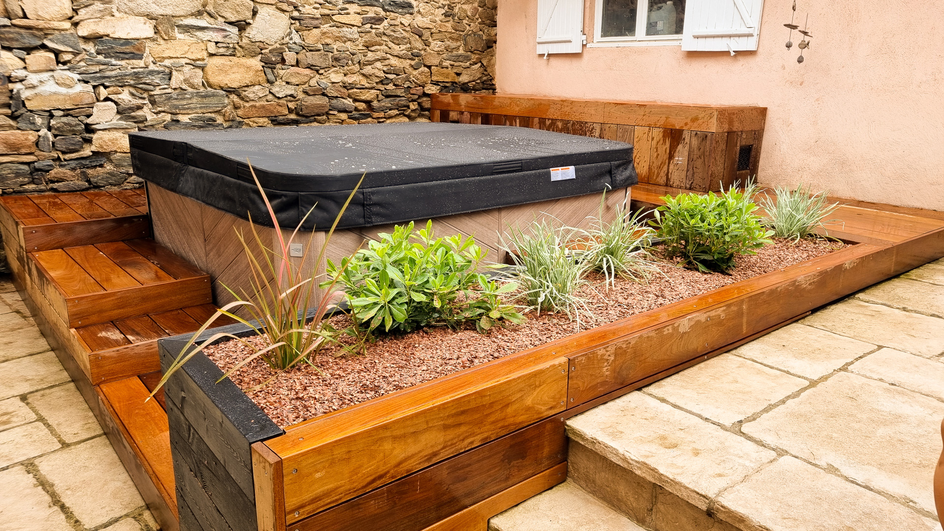 L’aménagement d’un spa est particulier en ça que le démontage des parois d’accès aux zones techniques doit pouvoir se faire sans démontage des abords. Tout doit donc être conçu pour être démontable sans outil. Autre difficulté sur ce projet: rendre l’accès plus ergonomique qu’il ne l’était sans prendre plus de place sur le petit espace qu’est cette cour intérieure de maison de village. J’ai donc pensé l’espace en optimisant les espaces de plage et en limitant la largeur des marches d’accès, une banquette coffre étanche permet le rangement en saison des coussins et autres accessoires de ce petit espace de détente, ainsi que la mise en place de coussins pour un moment de convivialité. La jardinière existante a été refaite en pin traité, et protégée afin de la rendre résistante dans le temps, puis plantée de végétation basse et fleurie. Les caissons amovibles ont été réalisés en structure exotique, et platelage ipé, puis positionnés sur une sous-structure en pin pour pus de stabilité. L’ensemble des deux faces d’accès sont intégralement démontable sans outils. Le mur en pierre a été suivi de près lors du travail de coupes, demandant patience et précision. Un espace terminé des plus cosy, en accord avec le mode de vie et les attentes de les clients, qui n’ont plus qu’à buller!