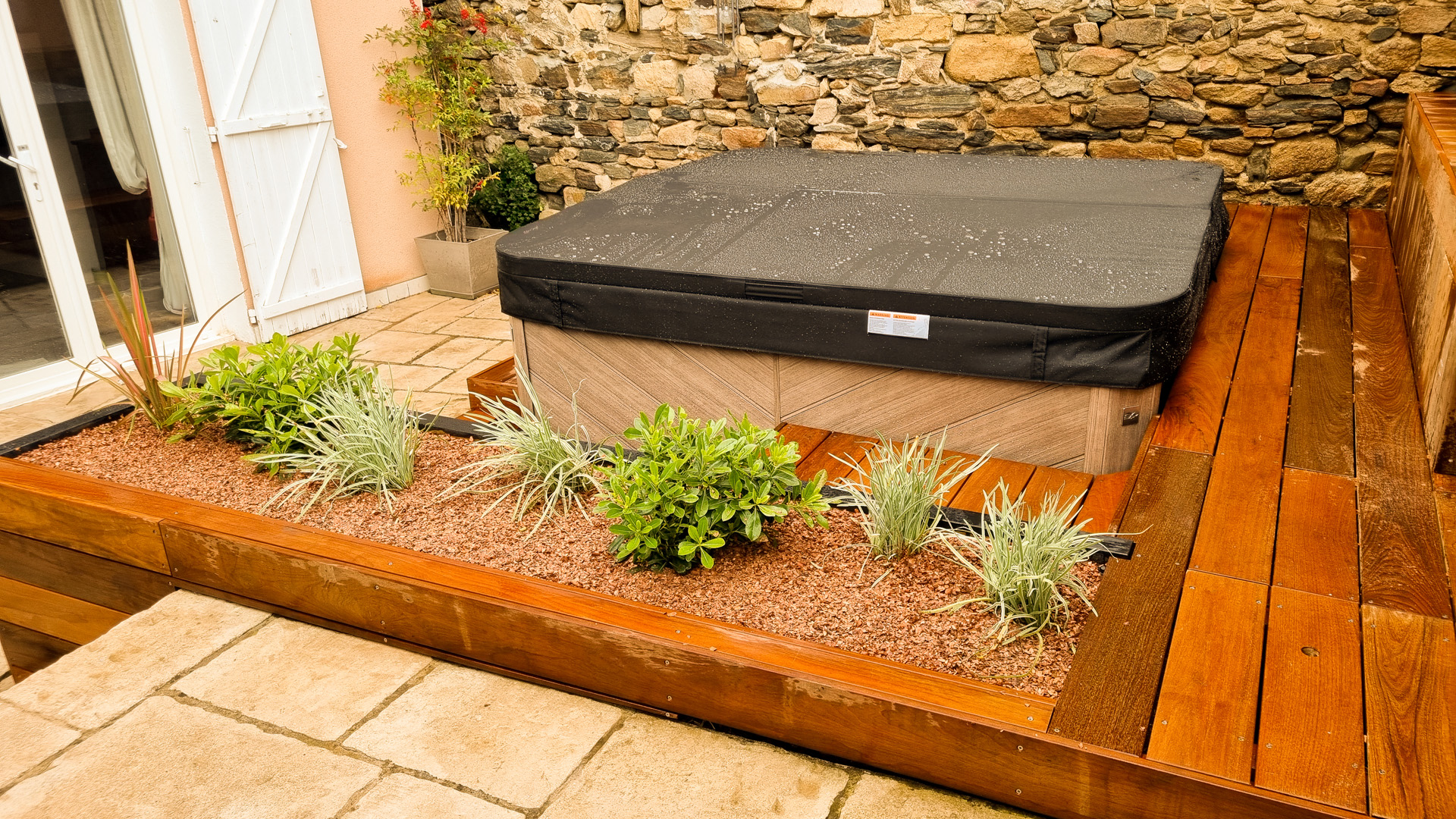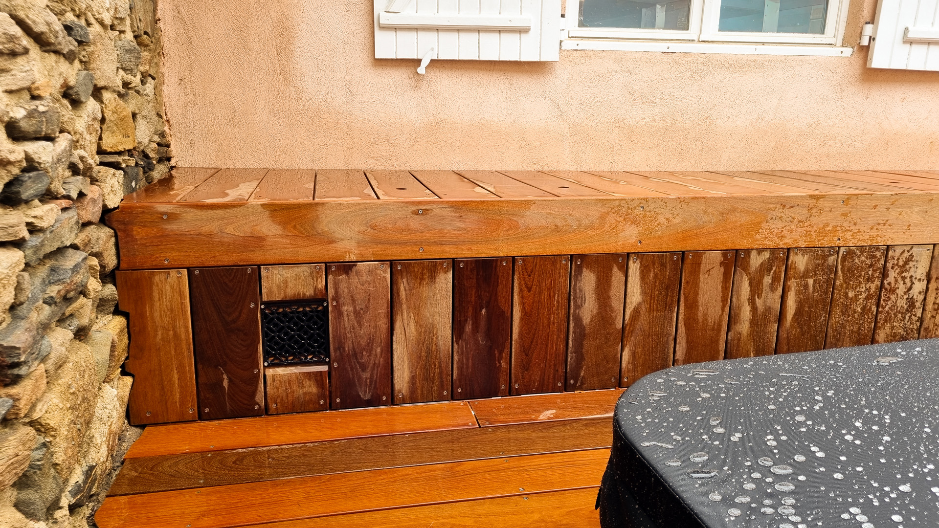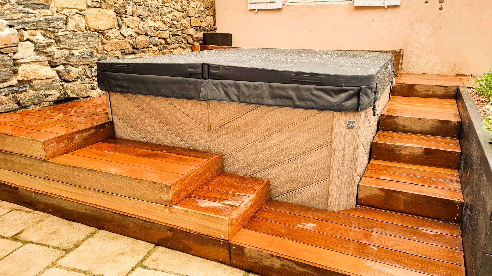 L’aménagement d’un spa est particulier en ça que le démontage des parois d’accès aux zones techniques doit pouvoir se faire sans démontage des abords. Tout doit donc être conçu pour être démontable sans outil. Autre difficulté sur ce projet: rendre l’accès plus ergonomique qu’il ne l’était sans prendre plus de place sur le petit espace qu’est cette cour intérieure de maison de village. J’ai donc pensé l’espace en optimisant les espaces de plage et en limitant la largeur des marches d’accès, une banquette coffre étanche permet le rangement en saison des coussins et autres accessoires de ce petit espace de détente, ainsi que la mise en place de coussins pour un moment de convivialité. La jardinière existante a été refaite en pin traité, et protégée afin de la rendre résistante dans le temps, puis plantée de végétation basse et fleurie. Les caissons amovibles ont été réalisés en structure exotique, et platelage ipé, puis positionnés sur une sous-structure en pin pour pus de stabilité. L’ensemble des deux faces d’accès sont intégralement démontable sans outils. Le mur en pierre a été suivi de près lors du travail de coupes, demandant patience et précision. Un espace terminé des plus cosy, en accord avec le mode de vie et les attentes de les clients, qui n’ont plus qu’à buller!