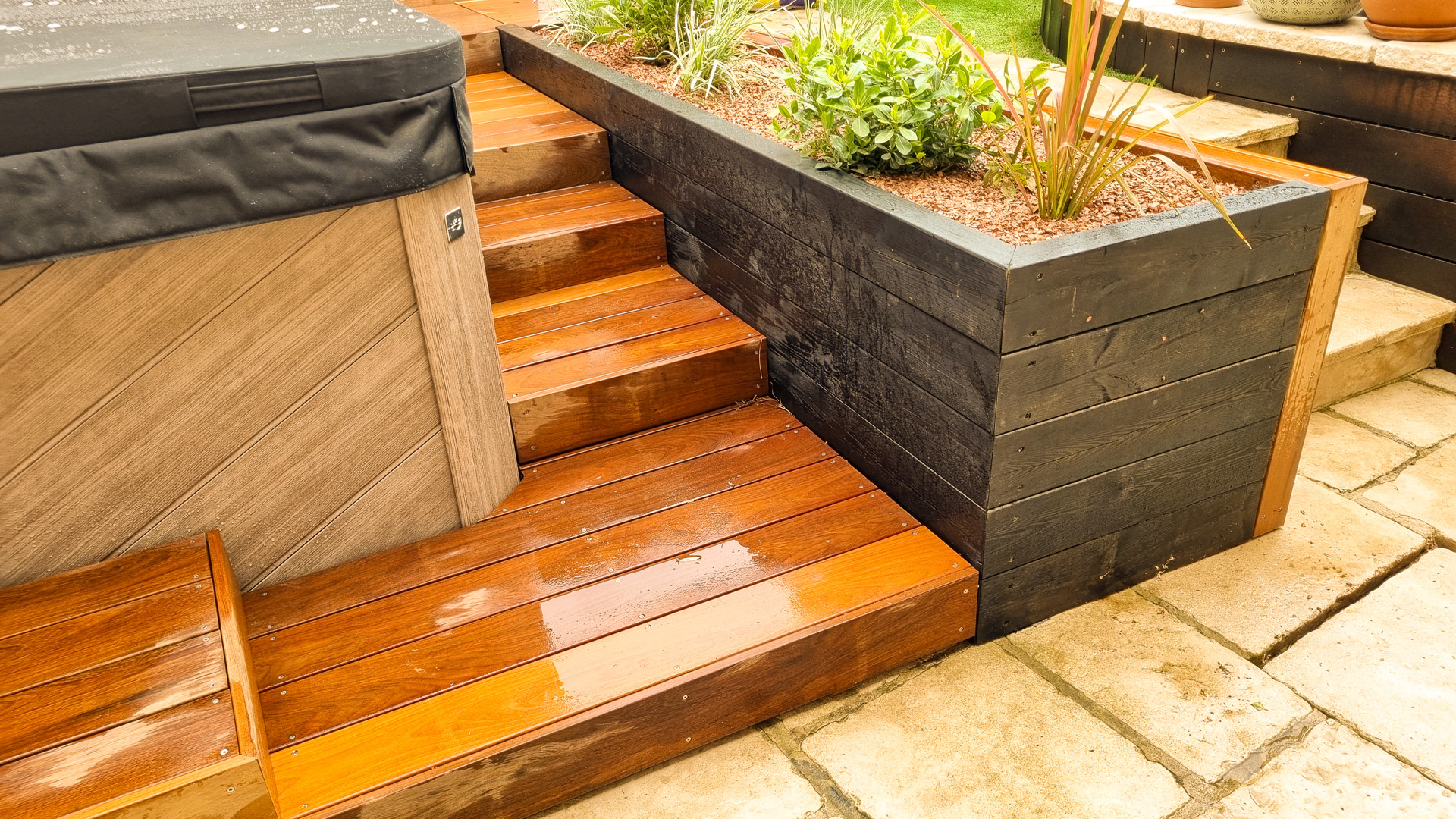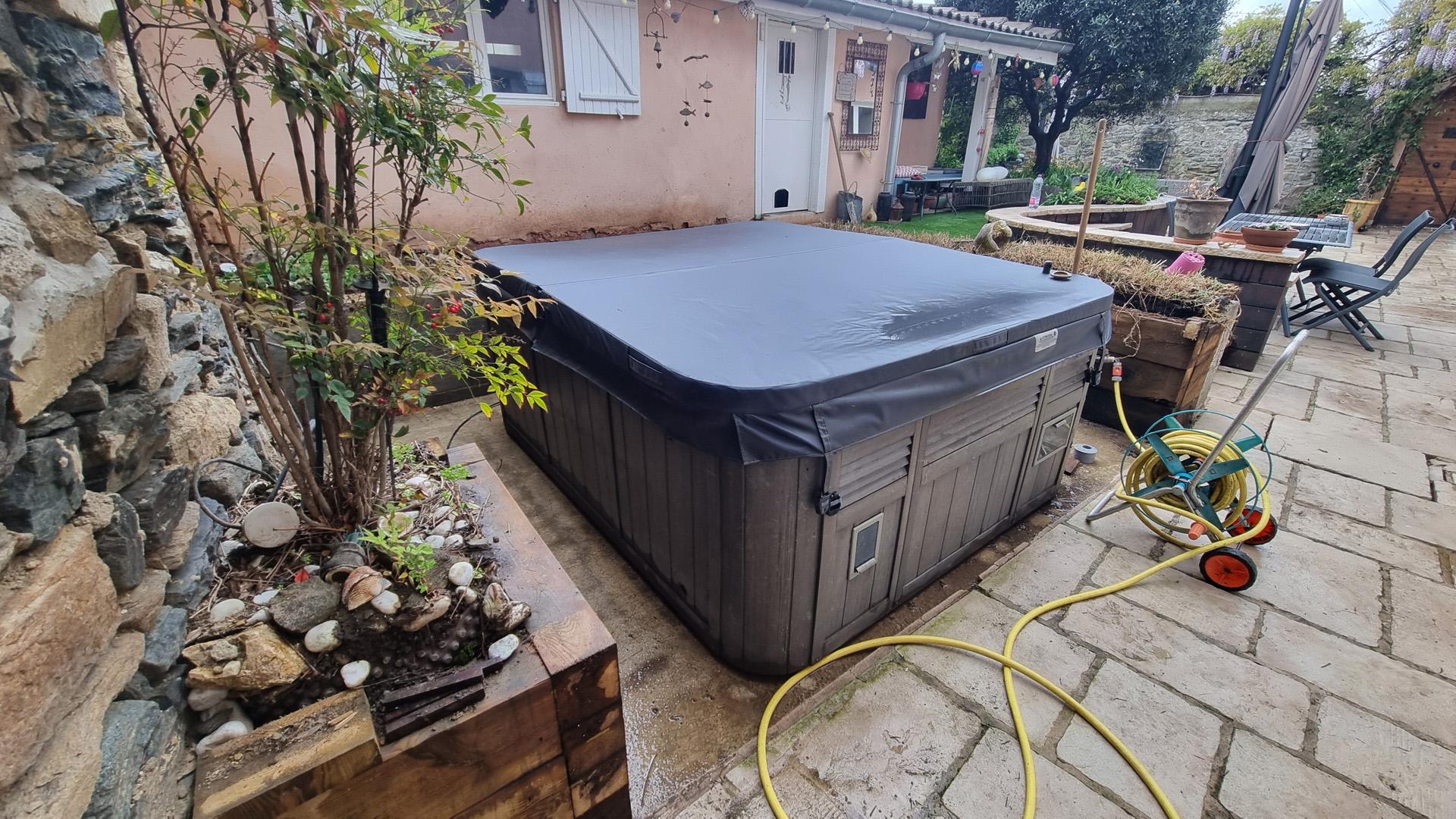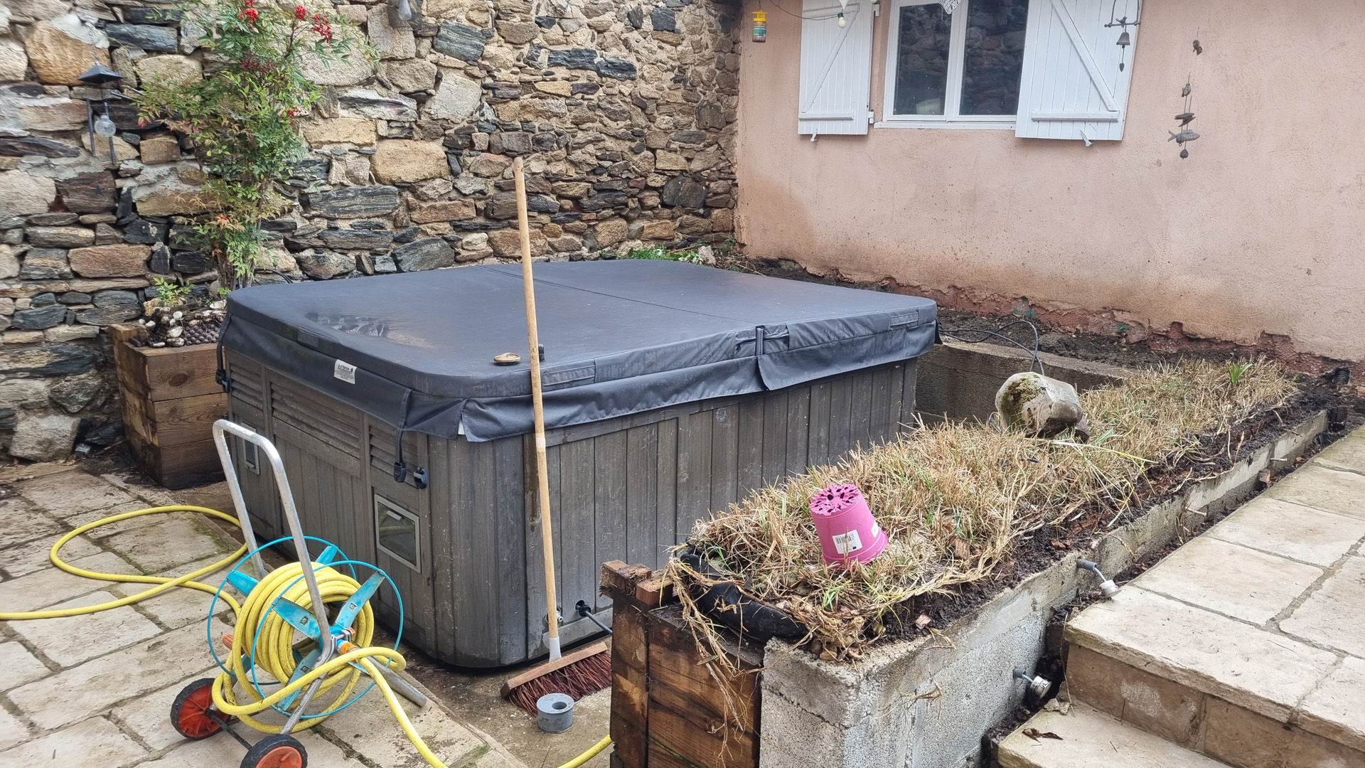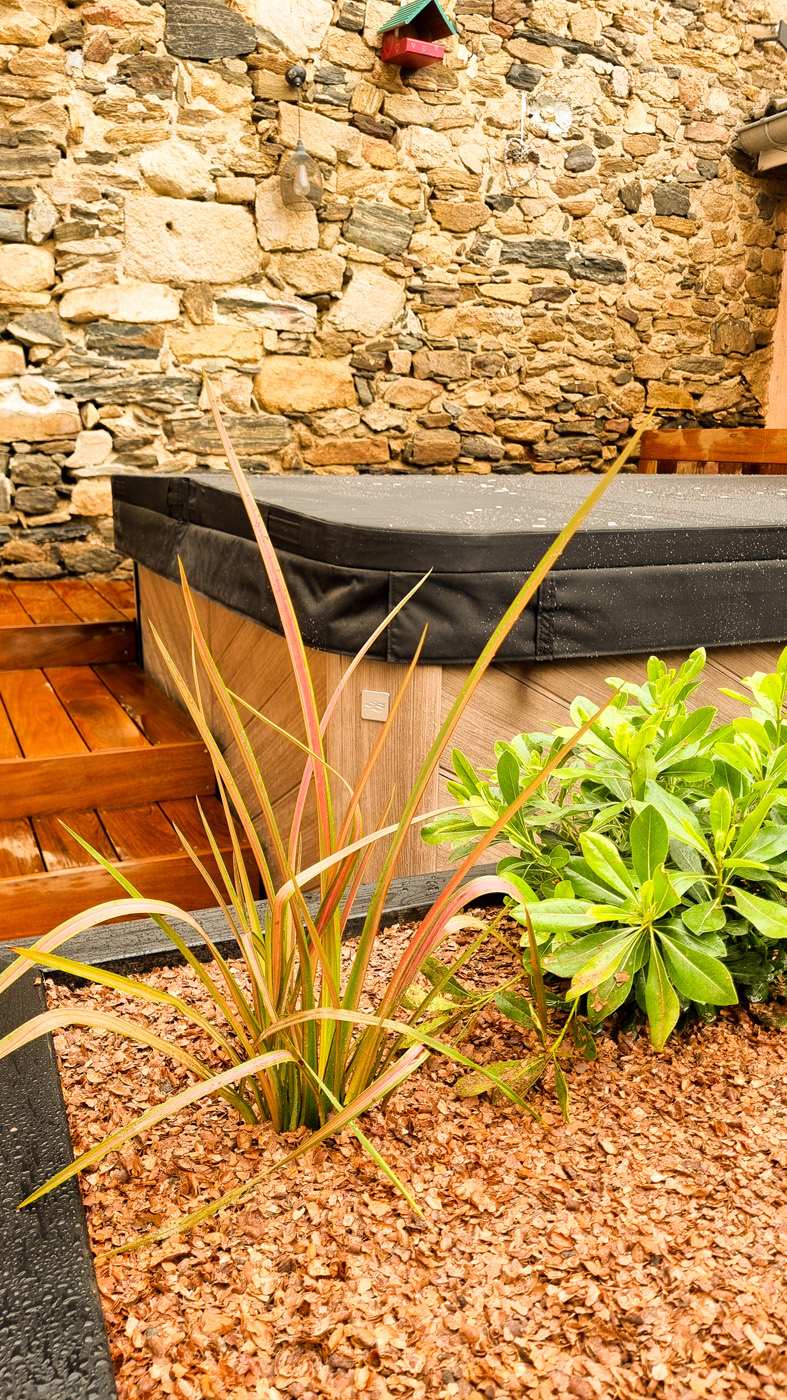 L’aménagement d’un spa est particulier en ça que le démontage des parois d’accès aux zones techniques doit pouvoir se faire sans démontage des abords. Tout doit donc être conçu pour être démontable sans outil. Autre difficulté sur ce projet: rendre l’accès plus ergonomique qu’il ne l’était sans prendre plus de place sur le petit espace qu’est cette cour intérieure de maison de village. J’ai donc pensé l’espace en optimisant les espaces de plage et en limitant la largeur des marches d’accès, une banquette coffre étanche permet le rangement en saison des coussins et autres accessoires de ce petit espace de détente, ainsi que la mise en place de coussins pour un moment de convivialité. La jardinière existante a été refaite en pin traité, et protégée afin de la rendre résistante dans le temps, puis plantée de végétation basse et fleurie. Les caissons amovibles ont été réalisés en structure exotique, et platelage ipé, puis positionnés sur une sous-structure en pin pour pus de stabilité. L’ensemble des deux faces d’accès sont intégralement démontable sans outils. Le mur en pierre a été suivi de près lors du travail de coupes, demandant patience et précision. Un espace terminé des plus cosy, en accord avec le mode de vie et les attentes de les clients, qui n’ont plus qu’à buller!