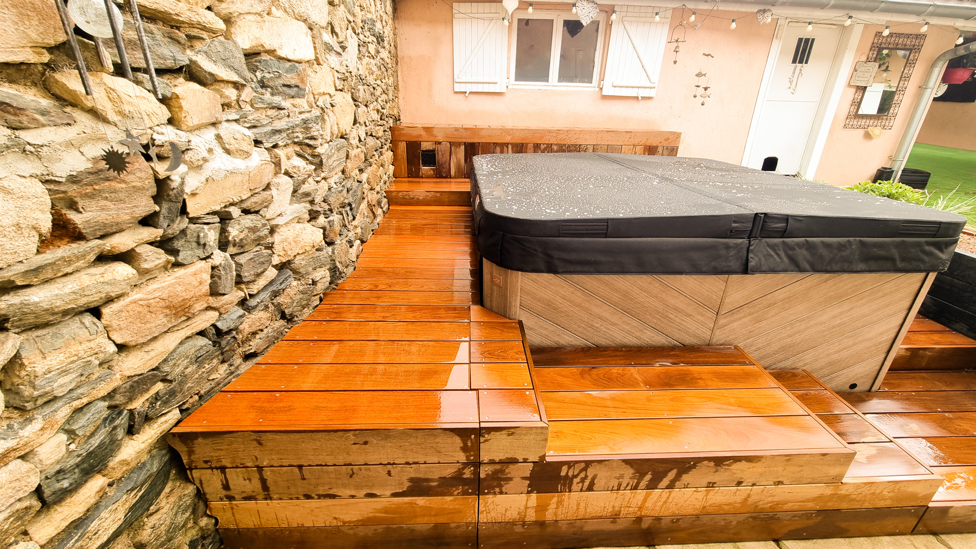 Suite au remplacement de leur Spa pour un modèle plus récent, mes clients ont souhaité repenser cet espace de détente avec un habillage bois complet.